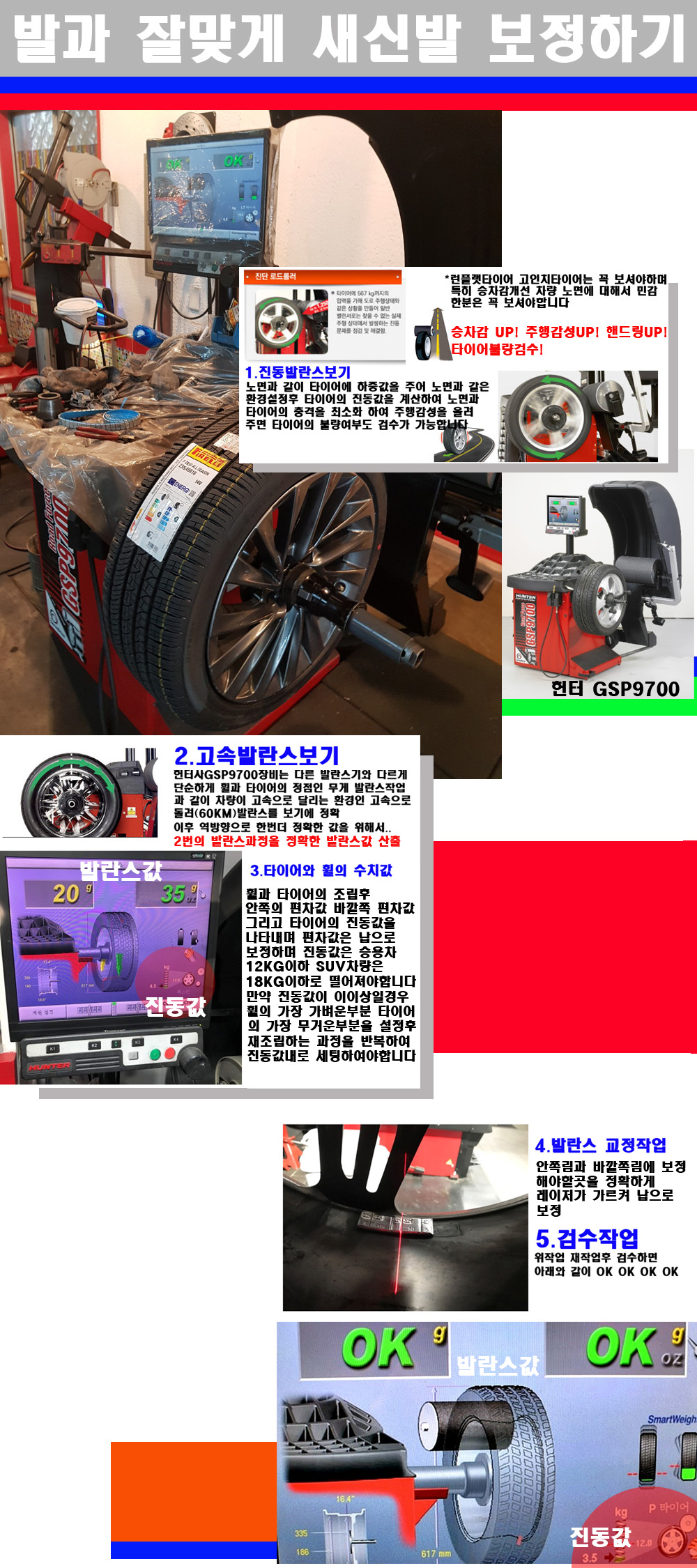 그리고 작업자에게는 불필요한 발란스납을 붙이지 않아 미관상으로 좋고 납을 절약하는 고객님에게도윈이고 작업자에게도 윈윈할수 있는 장비입니다 그리고 시중에서 고속진동발란스라고 말하시는 샵들이 많은데 꼭아셔야하는것은 고속발란스는 말그대로 발란스를 볼때 고속으로 돌리기에 60키로 전후 그리고 진동값을 계산하기위해서는 발란스기에 진동롤러가 있어야합니다 그래서 미국헌터사 GSP9700장비가 유일합니다 다른 샵에서 말하는 발란스기는 고속진동발란스기능없는 일반발란스 기기입니다 이점 꼭 아시고 장착하시기를 바랍니다