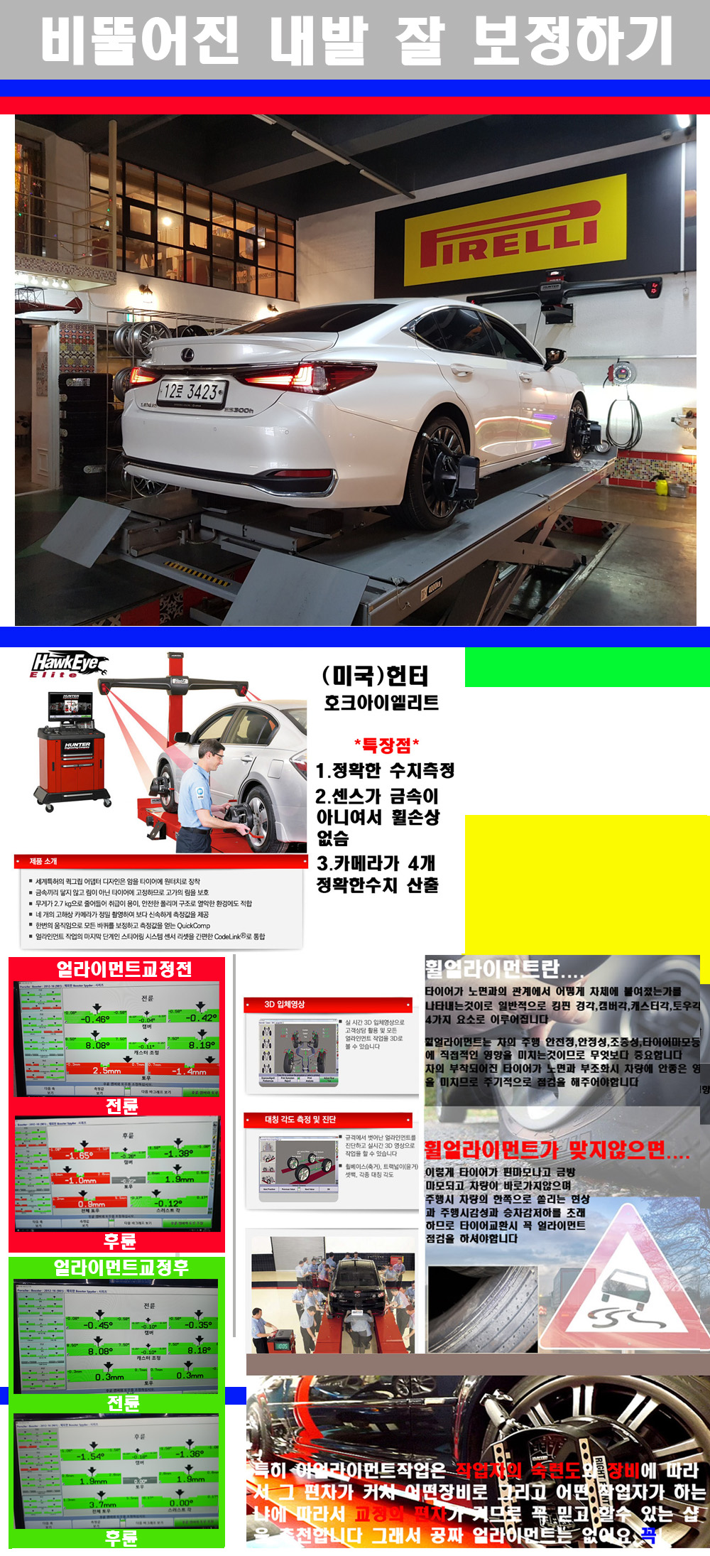 자사는 얼라이먼트정렬시 교정전 교정후를 구분하여 고객님께 직접 이수치값을 확인시켜드리고 작업을 하며 이후 각각의 특성을 가진 타이어들에 대해서 설명 및 관리요령 운전요령 같이 설명해드리고 있습니다