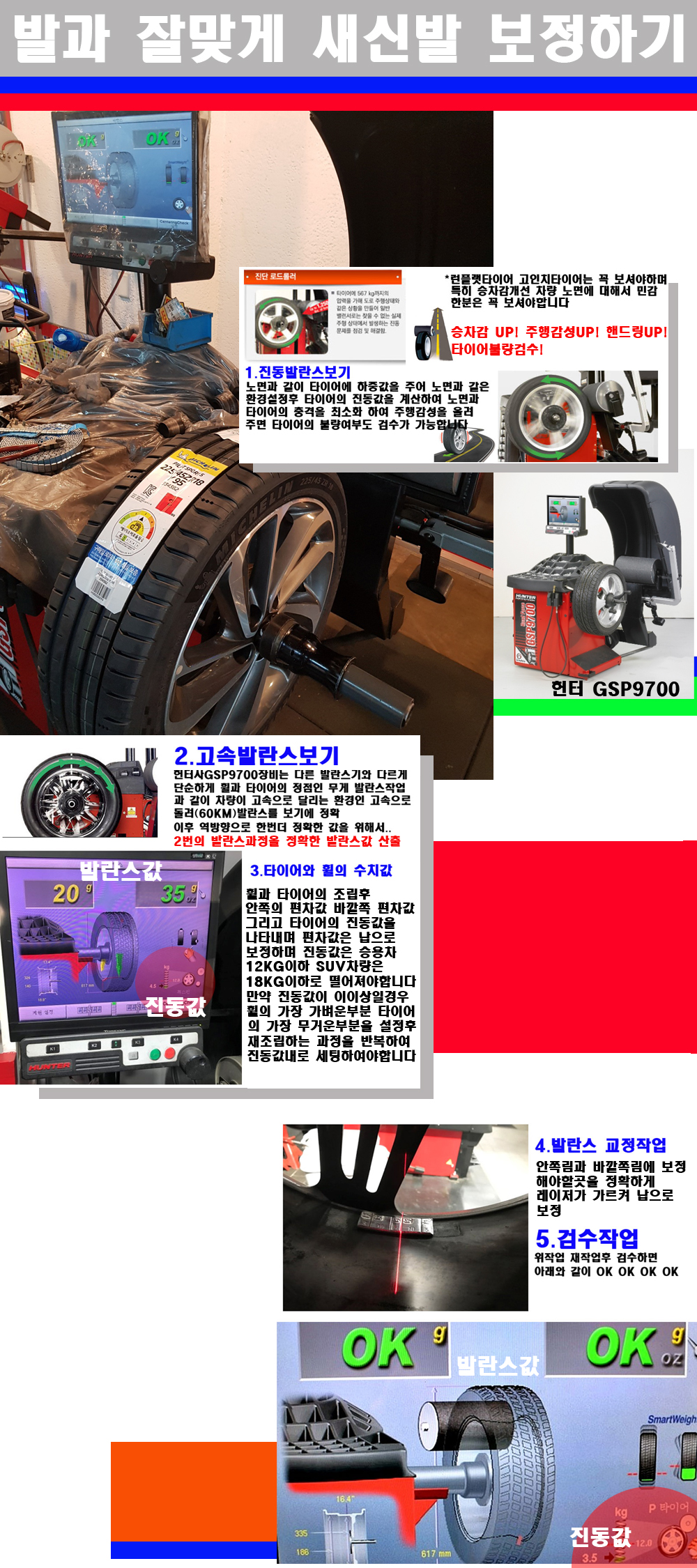 그리고 작업자에게는 불필요한 발란스납을 붙이지 않아 미관상으로 좋고 납을 절약하는 고객님에게도윈이고 작업자에게도 윈윈할수 있는 장비입니다 그리고 시중에서 고속진동발란스라고 말하시는 샵들이 많은데 꼭아셔야하는것은 고속발란스는 말그대로 발란스를 볼때 고속으로 돌리기에 60키로 전후 그리고 진동값을 계산하기위해서는 발란스기에 진동롤러가 있어야합니다 그래서 미국헌터사 GSP9700장비가 유일합니다 다른 샵에서 말하는 발란스기는 고속진동발란스기능없는 일반발란스 기기입니다 이점 꼭 아시고 장착하시기를 바랍니다