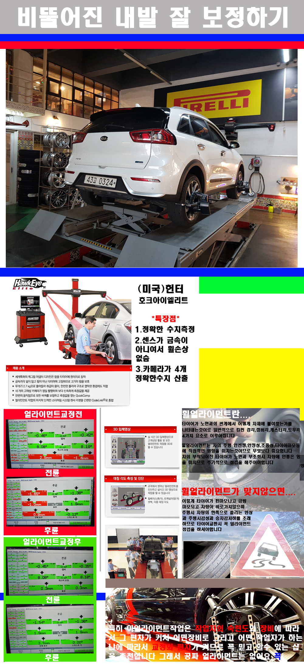 자사는 얼라이먼트정렬시 교정전 교정후를 구분하여 고객님께 직접 이수치값을 확인시켜드리고 작업을 하며 이후 각각의 특성을 가진 타이어들에 대해서 설명 및 관리요령 운전요령 같이 설명해드리고 있습니다