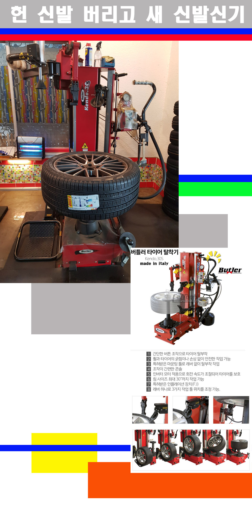 이태리 버틀러사의 켄도3.0S는 휠과 타이어와 조립과 분리시 전혀 제품에 손상을 주지않는 탈착기로 특히 센터락방식(중앙에서 휠를 고정하는 방식)이여서 휠의 중앙부위 잡아서 타이어를 탈부착하고 이후 상하롤러로 타이어를 탈부착합니다 특히 유니포미티작업(휠의 가장가벼운부분과 타이어의 가장 무거운부분을 매칭시키는 작업)시 작업자가 타이어를 정확한 지점에 휠과 매칭시킬수 있는 장점도 있습니다