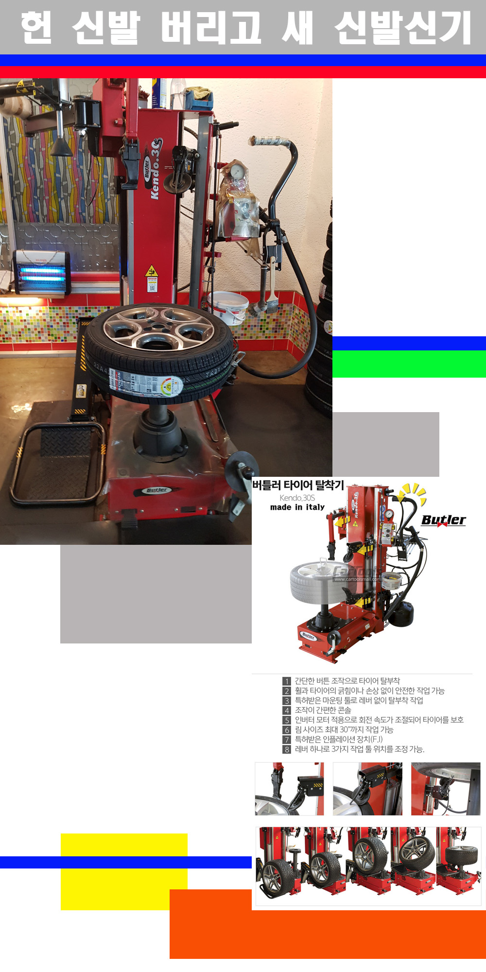 이태리 버틀러사의 켄도3.0S는 휠과 타이어와 조립과 분리시 전혀 제품에 손상을 주지않는 탈착기로 특히 센터락방식(중앙에서 휠를 고정하는 방식)이여서 휠의 중앙부위 잡아서 타이어를 탈부착하고 이후 상하롤러로 타이어를 탈부착합니다 특히 유니포미티작업(휠의 가장가벼운부분과 타이어의 가장 무거운부분을 매칭시키는 작업)시 작업자가 타이어를 정확한 지점에 휠과 매칭시킬수 있는 장점도 있습니다
