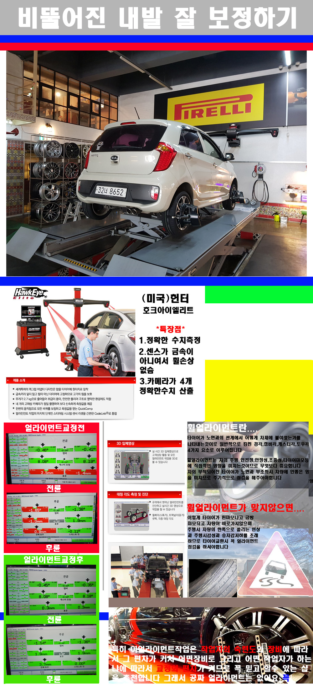 자사는 얼라이먼트정렬시 교정전 교정후를 구분하여 고객님께 직접 이수치값을 확인시켜드리고 작업을 하며 이후 각각의 특성을 가진 타이어들에 대해서 설명 및 관리요령 운전요령 같이 설명해드리고 있습니다