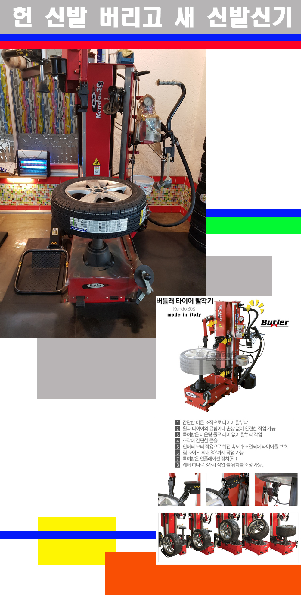 이태리 버틀러사의 켄도3.0S는 휠과 타이어와 조립과 분리시 전혀 제품에 손상을 주지않는 탈착기로 특히 센터락방식(중앙에서 휠를 고정하는 방식)이여서 휠의 중앙부위 잡아서 타이어를 탈부착하고 이후 상하롤러로 타이어를 탈부착합니다 특히 유니포미티작업(휠의 가장가벼운부분과 타이어의 가장 무거운부분을 매칭시키는 작업)시 작업자가 타이어를 정확한 지점에 휠과 매칭시킬수 있는 장점도 있습니다