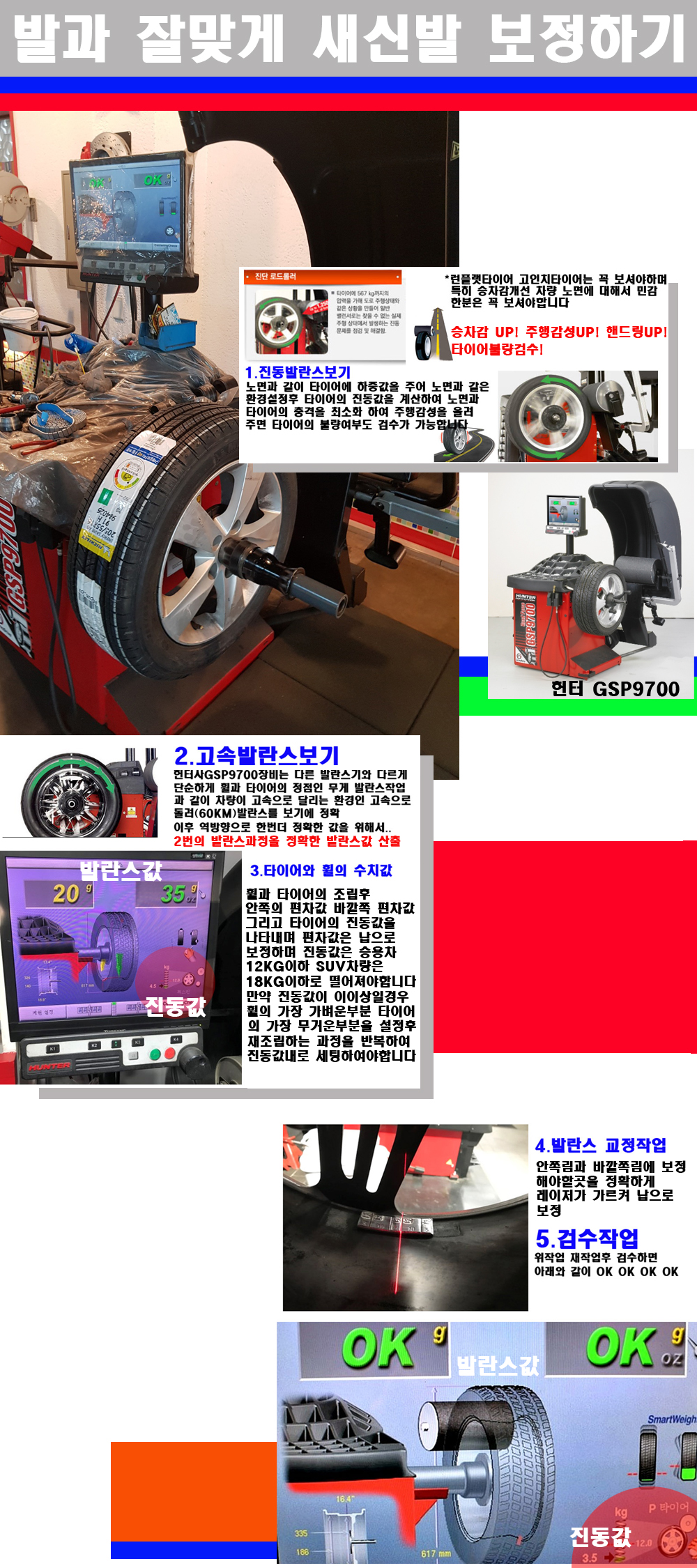 그리고 작업자에게는 불필요한 발란스납을 붙이지 않아 미관상으로 좋고 납을 절약하는 고객님에게도윈이고 작업자에게도 윈윈할수 있는 장비입니다 그리고 시중에서 고속진동발란스라고 말하시는 샵들이 많은데 꼭아셔야하는것은 고속발란스는 말그대로 발란스를 볼때 고속으로 돌리기에 60키로 전후 그리고 진동값을 계산하기위해서는 발란스기에 진동롤러가 있어야합니다 그래서 미국헌터사 GSP9700장비가 유일합니다 다른 샵에서 말하는 발란스기는 고속진동발란스기능없는 일반발란스 기기입니다 이점 꼭 아시고 장착하시기를 바랍니다 이벤트:수입차량 순정품타이어 4개장착시 질소주입 고속진동발란스 얼라이먼트 무료해드리고 있습니다 작업옵션으로 작업비 12만원정도 되는 작업입니다 감사합니다