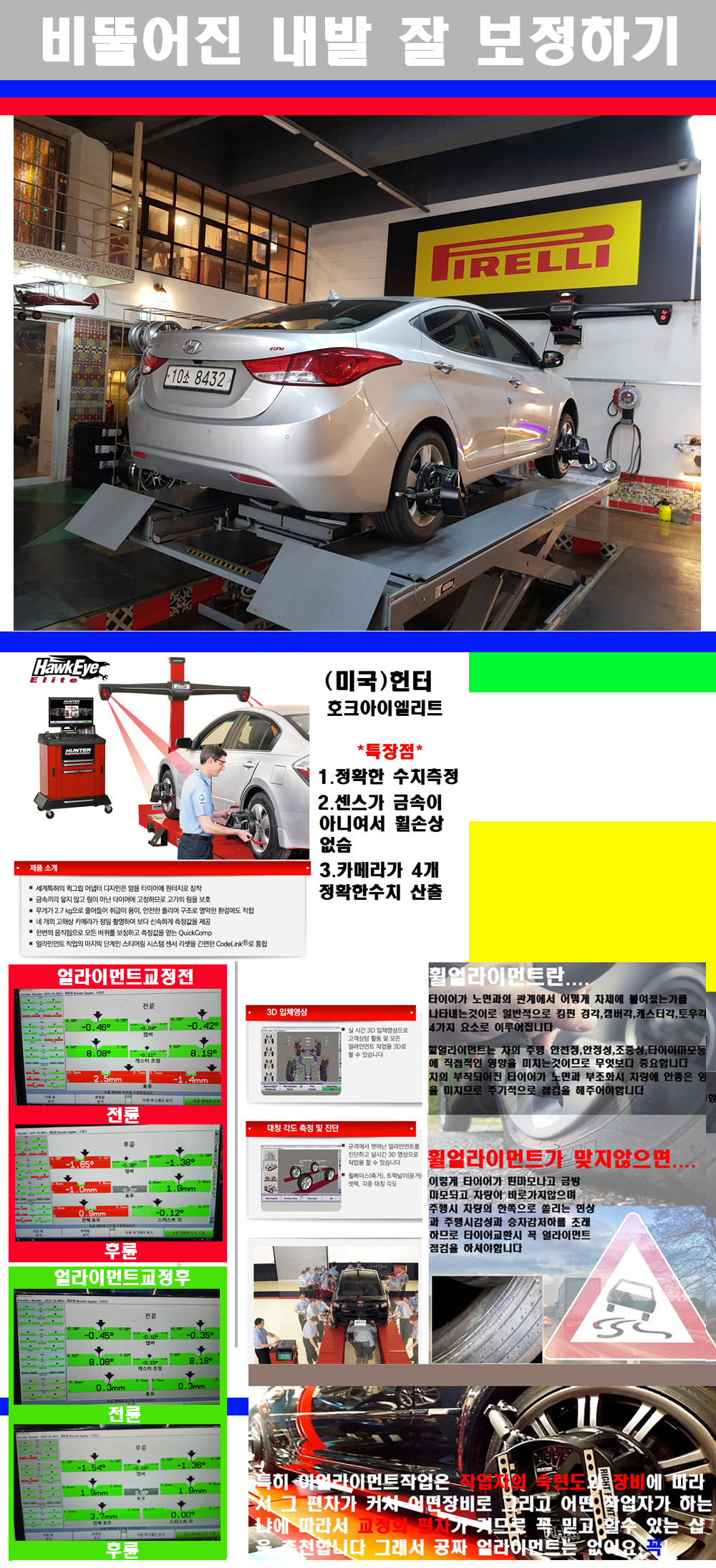 자사는 얼라이먼트정렬시 교정전 교정후를 구분하여 고객님께 직접 이수치값을 확인시켜드리고 작업을 하며 이후 각각의 특성을 가진 타이어들에 대해서 설명 및 관리요령 운전요령 같이 설명해드리고 있습니다