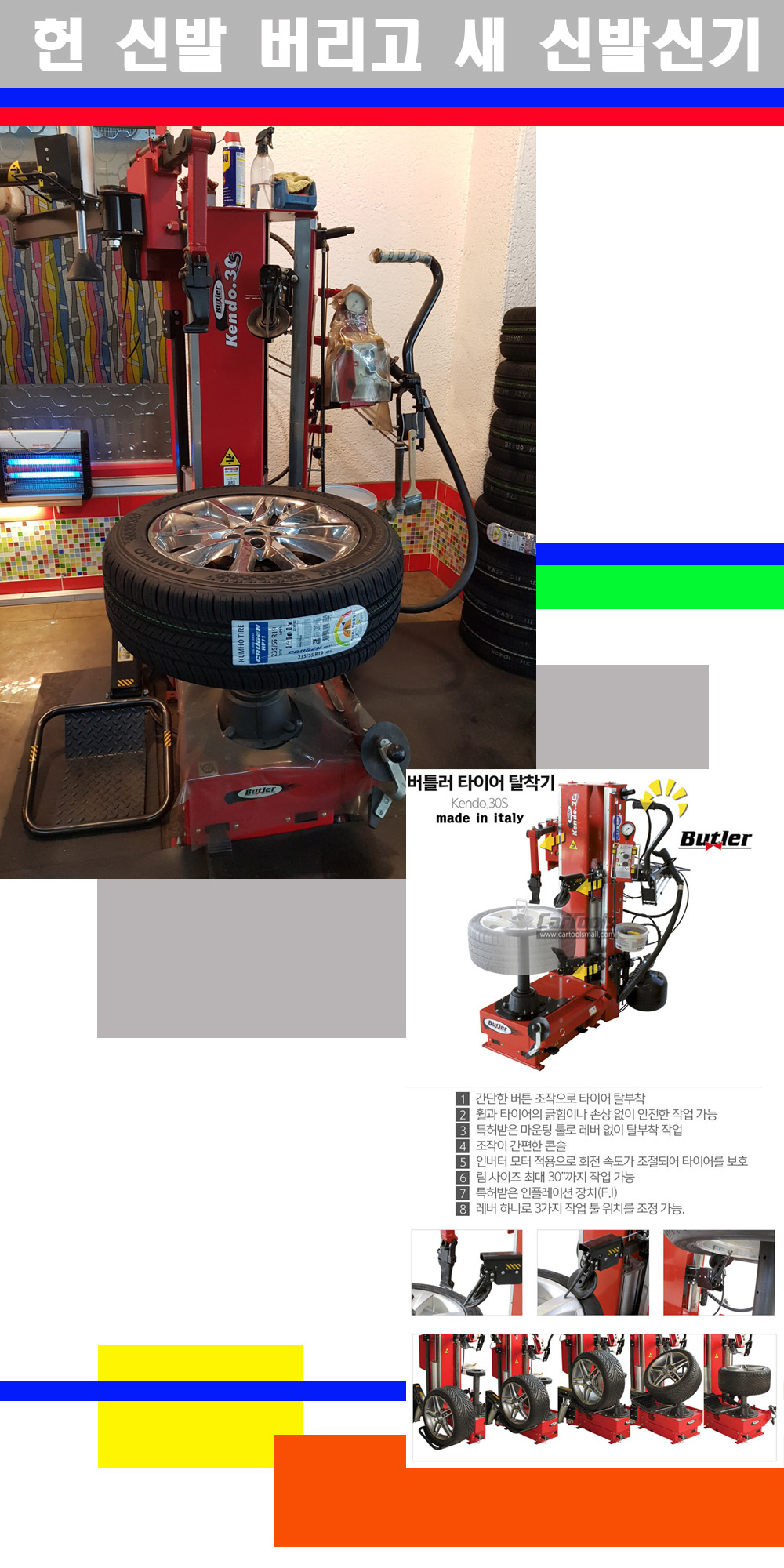 이태리 버틀러사의 켄도3.0S는 휠과 타이어와 조립과 분리시 전혀 제품에 손상을 주지않는 탈착기로 특히 센터락방식(중앙에서 휠를 고정하는 방식)이여서 휠의 중앙부위 잡아서 타이어를 탈부착하고 이후 상하롤러로 타이어를 탈부착합니다 특히 유니포미티작업(휠의 가장가벼운부분과 타이어의 가장 무거운부분을 매칭시키는 작업)시 작업자가 타이어를 정확한 지점에 휠과 매칭시킬수 있는 장점도 있습니다