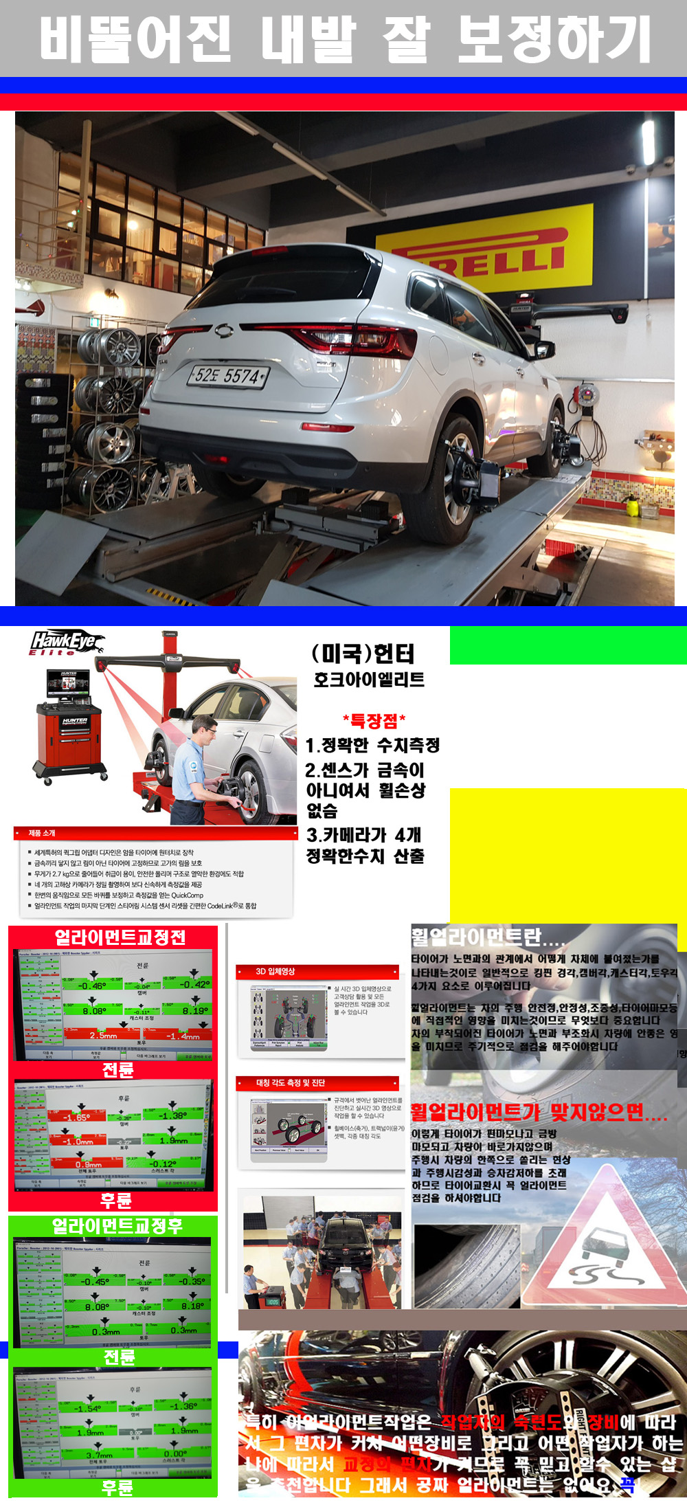 자사는 얼라이먼트정렬시 교정전 교정후를 구분하여 고객님께 직접 이수치값을 확인시켜드리고 작업을 하며 이후 각각의 특성을 가진 타이어들에 대해서 설명 및 관리요령 운전요령 같이 설명해드리고 있습니다