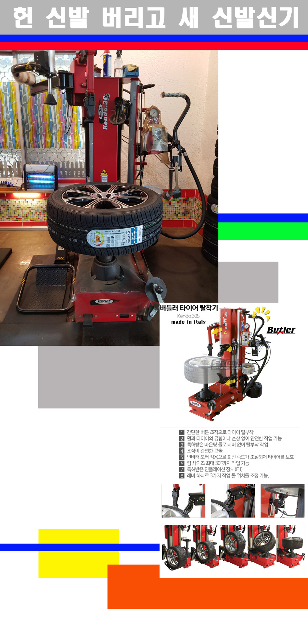 이태리 버틀러사의 켄도3.0S는 휠과 타이어와 조립과 분리시 전혀 제품에 손상을 주지않는 탈착기로 특히 센터락방식(중앙에서 휠를 고정하는 방식)이여서 휠의 중앙부위 잡아서 타이어를 탈부착하고 이후 상하롤러로 타이어를 탈부착합니다 특히 유니포미티작업(휠의 가장가벼운부분과 타이어의 가장 무거운부분을 매칭시키는 작업)시 작업자가 타이어를 정확한 지점에 휠과 매칭시킬수 있는 장점도 있습니다