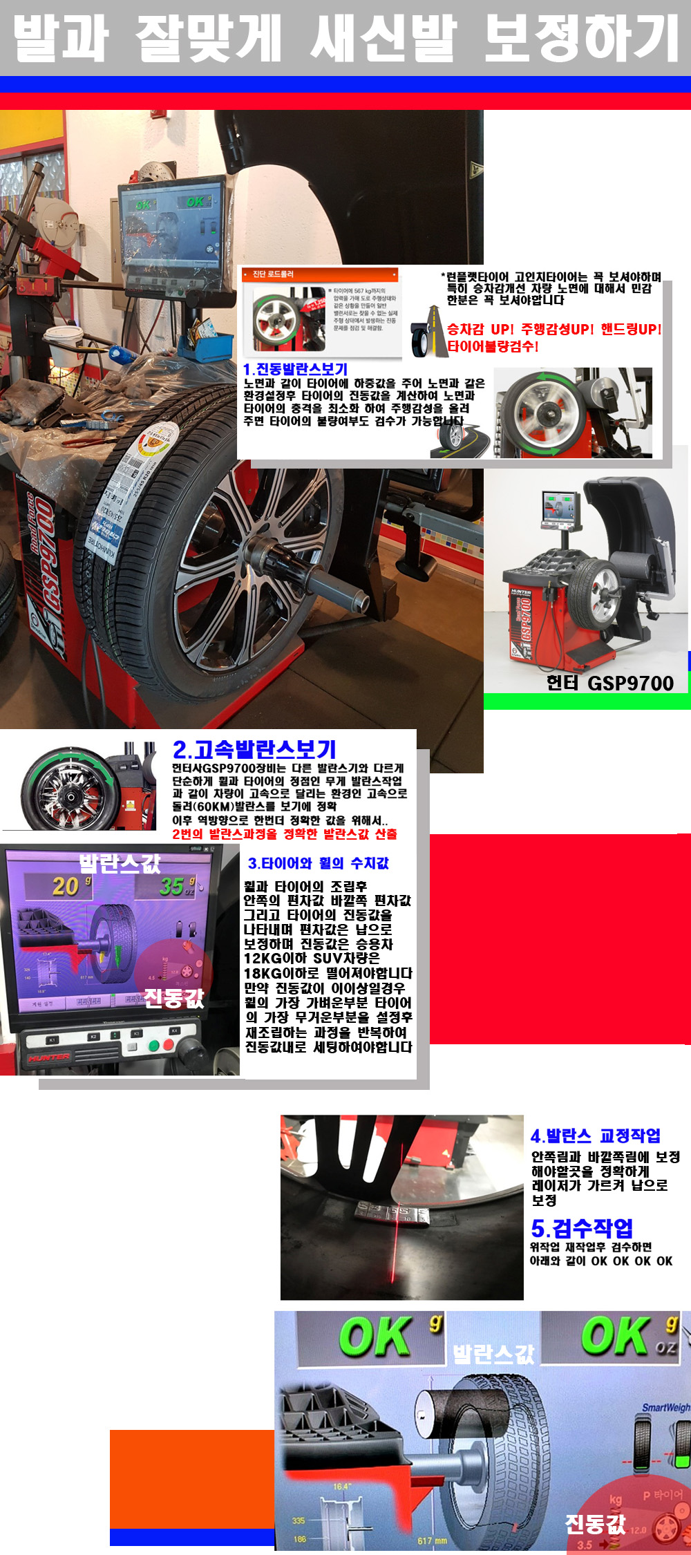 그리고 작업자에게는 불필요한 발란스납을 붙이지 않아 미관상으로 좋고 납을 절약하는 고객님에게도윈이고 작업자에게도 윈윈할수 있는 장비입니다 그리고 시중에서 고속진동발란스라고 말하시는 샵들이 많은데 꼭아셔야하는것은 고속발란스는 말그대로 발란스를 볼때 고속으로 돌리기에 60키로 전후 그리고 진동값을 계산하기위해서는 발란스기에 진동롤러가 있어야합니다 그래서 미국헌터사 GSP9700장비가 유일합니다 다른 샵에서 말하는 발란스기는 고속진동발란스기능없는 일반발란스 기기입니다 이점 꼭 아시고 장착하시기를 바랍니다 이벤트:수입차량 순정품타이어 4개장착시 질소주입 고속진동발란스 얼라이먼트 무료해드리고 있습니다 작업옵션으로 작업비 12만원정도 되는 작업입니다 감사합니다