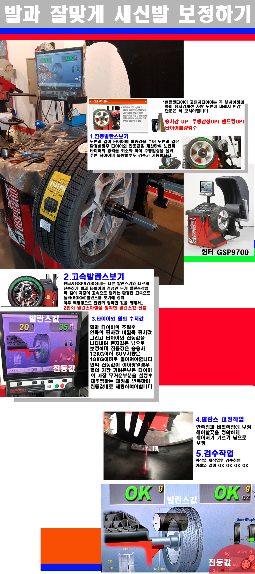 그리고 작업자에게는 불필요한 발란스납을 붙이지 않아 미관상으로 좋고 납을 절약하는 고객님에게도윈이고 작업자에게도 윈윈할수 있는 장비입니다 그리고 시중에서 고속진동발란스라고 말하시는 샵들이 많은데 꼭아셔야하는것은 고속발란스는 말그대로 발란스를 볼때 고속으로 돌리기에 60키로 전후 그리고 진동값을 계산하기위해서는 발란스기에 진동롤러가 있어야합니다 그래서 미국헌터사 GSP9700장비가 유일합니다 다른 샵에서 말하는 발란스기는 고속진동발란스기능없는 일반발란스 기기입니다 이점 꼭 아시고 장착하시기를 바랍니다 이벤트:수입차량 순정품타이어 4개장착시 질소주입 고속진동발란스 얼라이먼트 무료해드리고 있습니다 작업옵션으로 작업비 12만원정도 되는 작업입니다 감사합니다