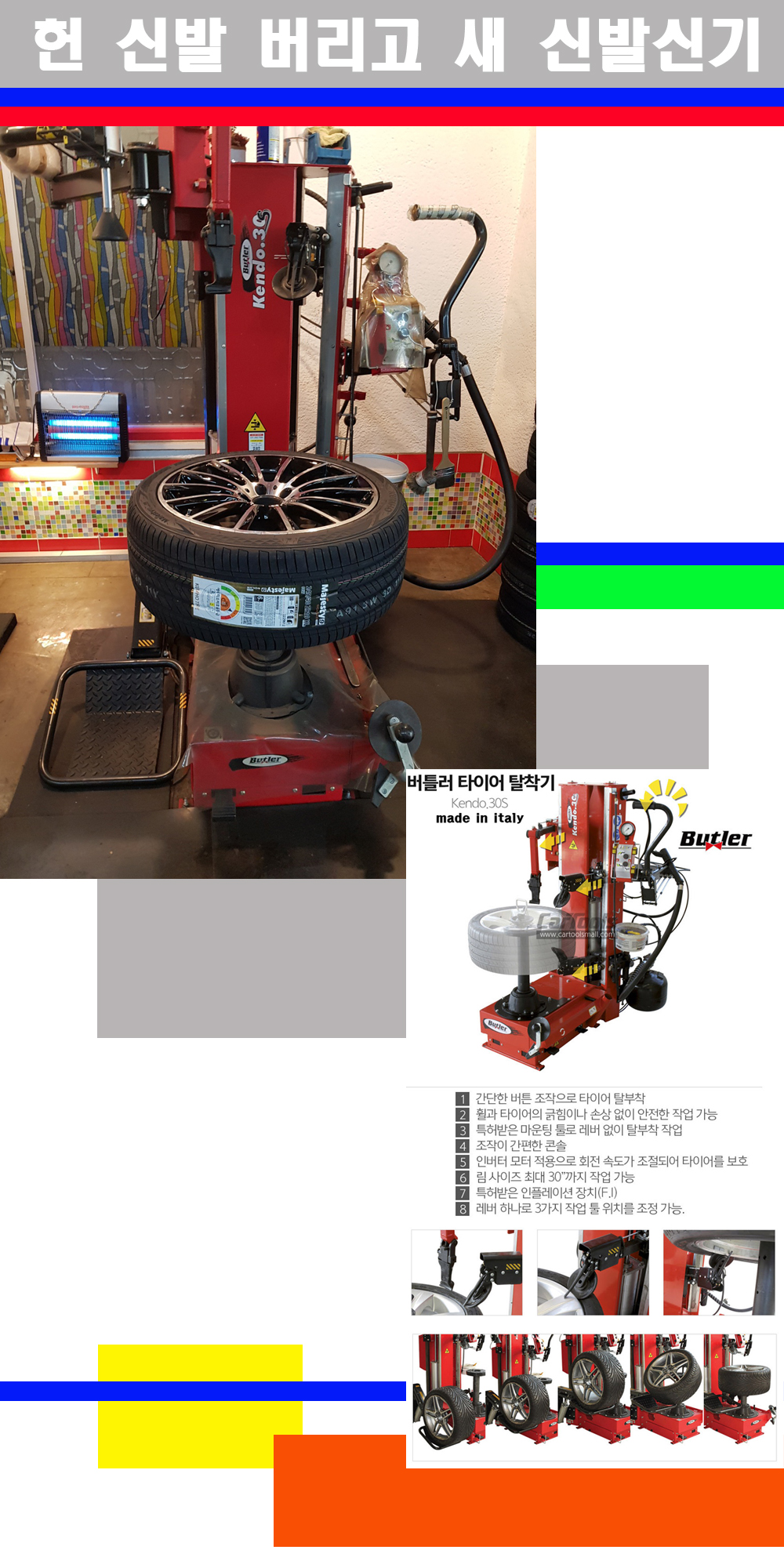 이태리 버틀러사의 켄도3.0S는 휠과 타이어와 조립과 분리시 전혀 제품에 손상을 주지않는 탈착기로 특히 센터락방식(중앙에서 휠를 고정하는 방식)이여서 휠의 중앙부위 잡아서 타이어를 탈부착하고 이후 상하롤러로 타이어를 탈부착합니다 특히 유니포미티작업(휠의 가장가벼운부분과 타이어의 가장 무거운부분을 매칭시키는 작업)시 작업자가 타이어를 정확한 지점에 휠과 매칭시킬수 있는 장점도 있습니다