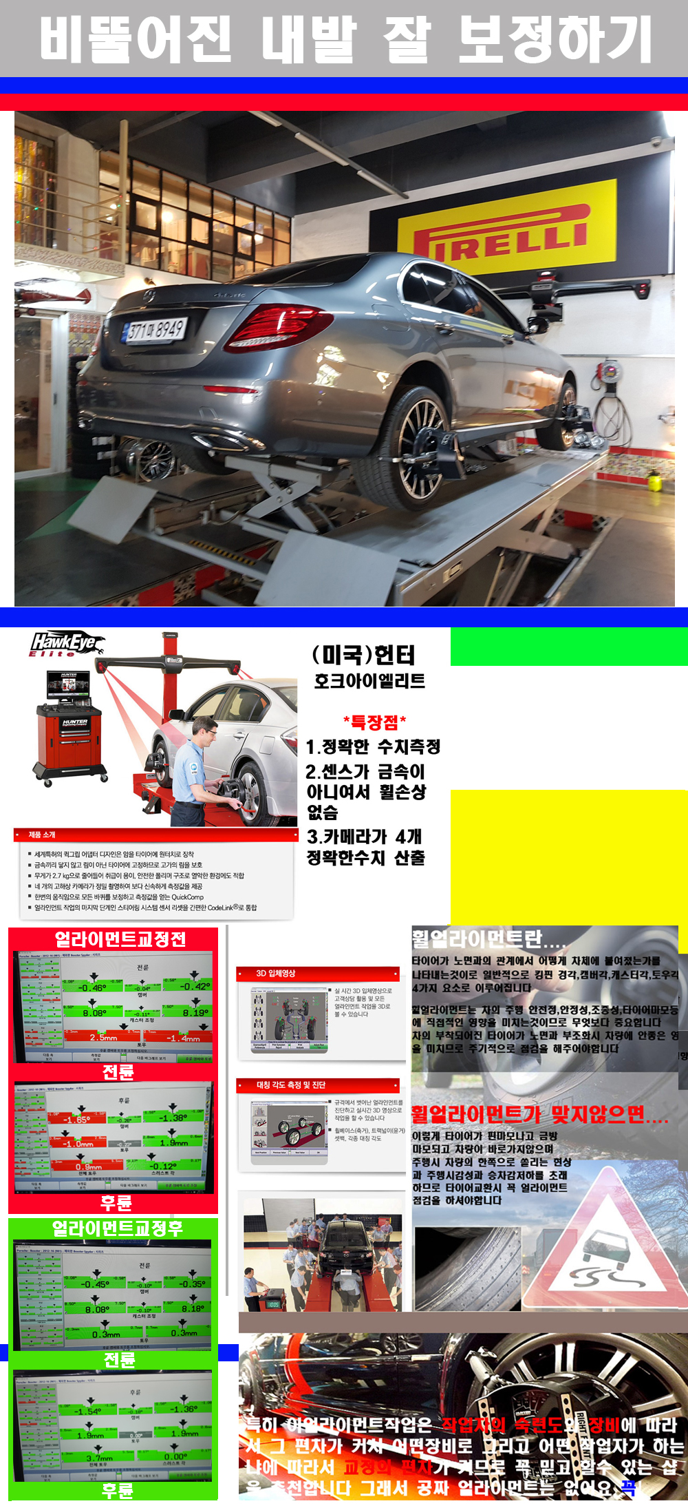 자사는 얼라이먼트정렬시 교정전 교정후를 구분하여 고객님께 직접 이수치값을 확인시켜드리고 작업을 하며 이후 각각의 특성을 가진 타이어들에 대해서 설명 및 관리요령 운전요령 같이 설명해드리고 있습니다