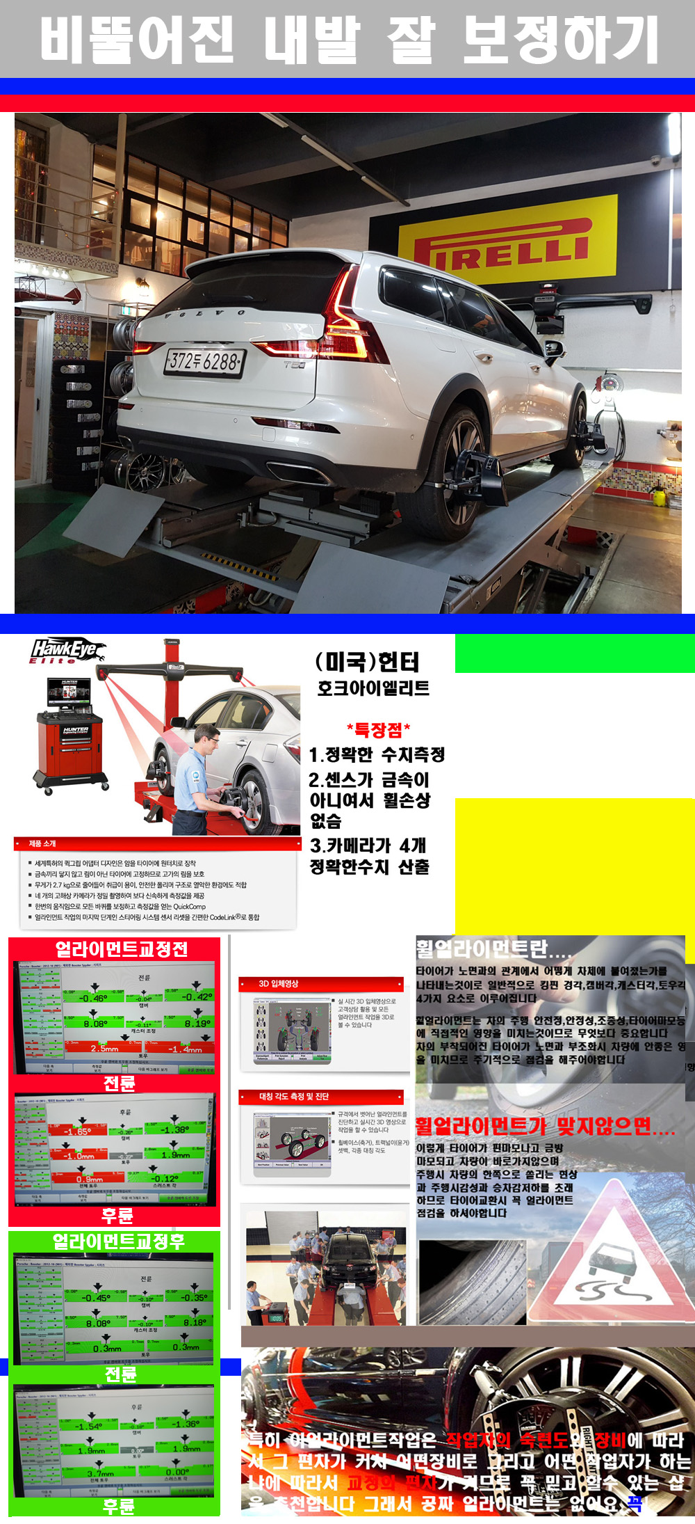 자사는 얼라이먼트정렬시 교정전 교정후를 구분하여 고객님께 직접 이수치값을 확인시켜드리고 작업을 하며 이후 각각의 특성을 가진 타이어들에 대해서 설명 및 관리요령 운전요령 같이 설명해드리고 있습니다