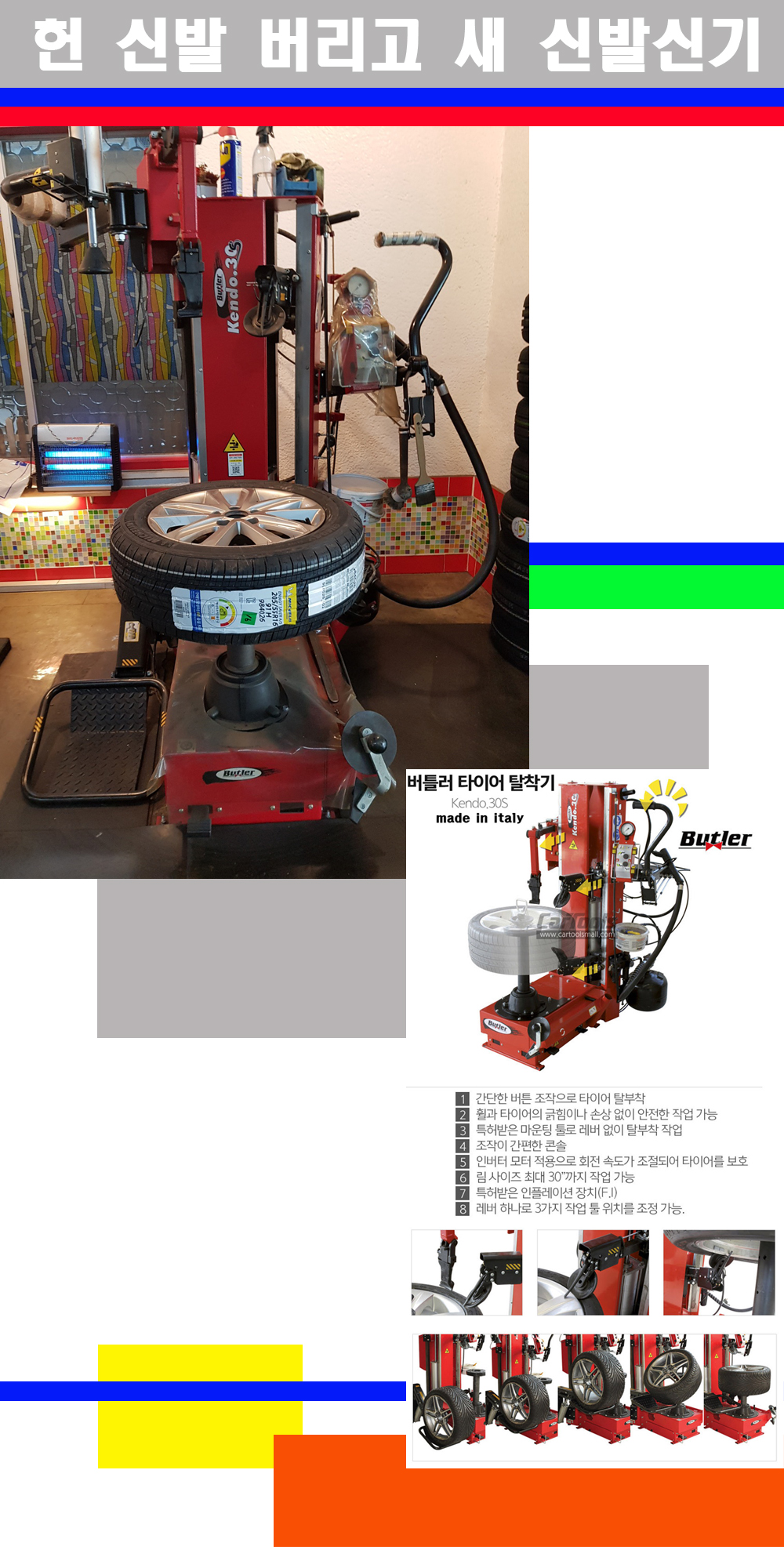 이태리 버틀러사의 켄도3.0S는 휠과 타이어와 조립과 분리시 전혀 제품에 손상을 주지않는 탈착기로 특히 센터락방식(중앙에서 휠를 고정하는 방식)이여서 휠의 중앙부위 잡아서 타이어를 탈부착하고 이후 상하롤러로 타이어를 탈부착합니다 특히 유니포미티작업(휠의 가장가벼운부분과 타이어의 가장 무거운부분을 매칭시키는 작업)시 작업자가 타이어를 정확한 지점에 휠과 매칭시킬수 있는 장점도 있습니다