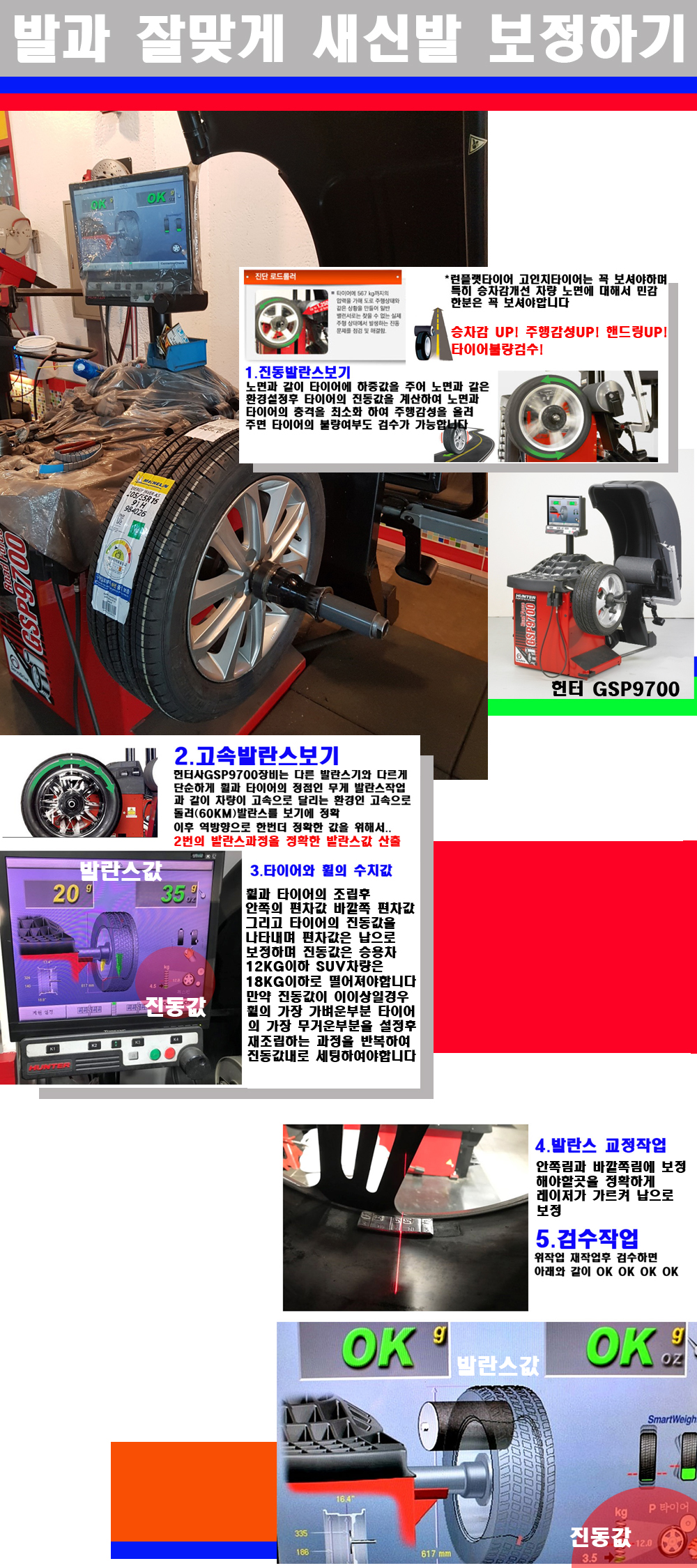 그리고 작업자에게는 불필요한 발란스납을 붙이지 않아 미관상으로 좋고 납을 절약하는 고객님에게도윈이고 작업자에게도 윈윈할수 있는 장비입니다 그리고 시중에서 고속진동발란스라고 말하시는 샵들이 많은데 꼭아셔야하는것은 고속발란스는 말그대로 발란스를 볼때 고속으로 돌리기에 60키로 전후 그리고 진동값을 계산하기위해서는 발란스기에 진동롤러가 있어야합니다 그래서 미국헌터사 GSP9700장비가 유일합니다 다른 샵에서 말하는 발란스기는 고속진동발란스기능없는 일반발란스 기기입니다 이점 꼭 아시고 장착하시기를 바랍니다