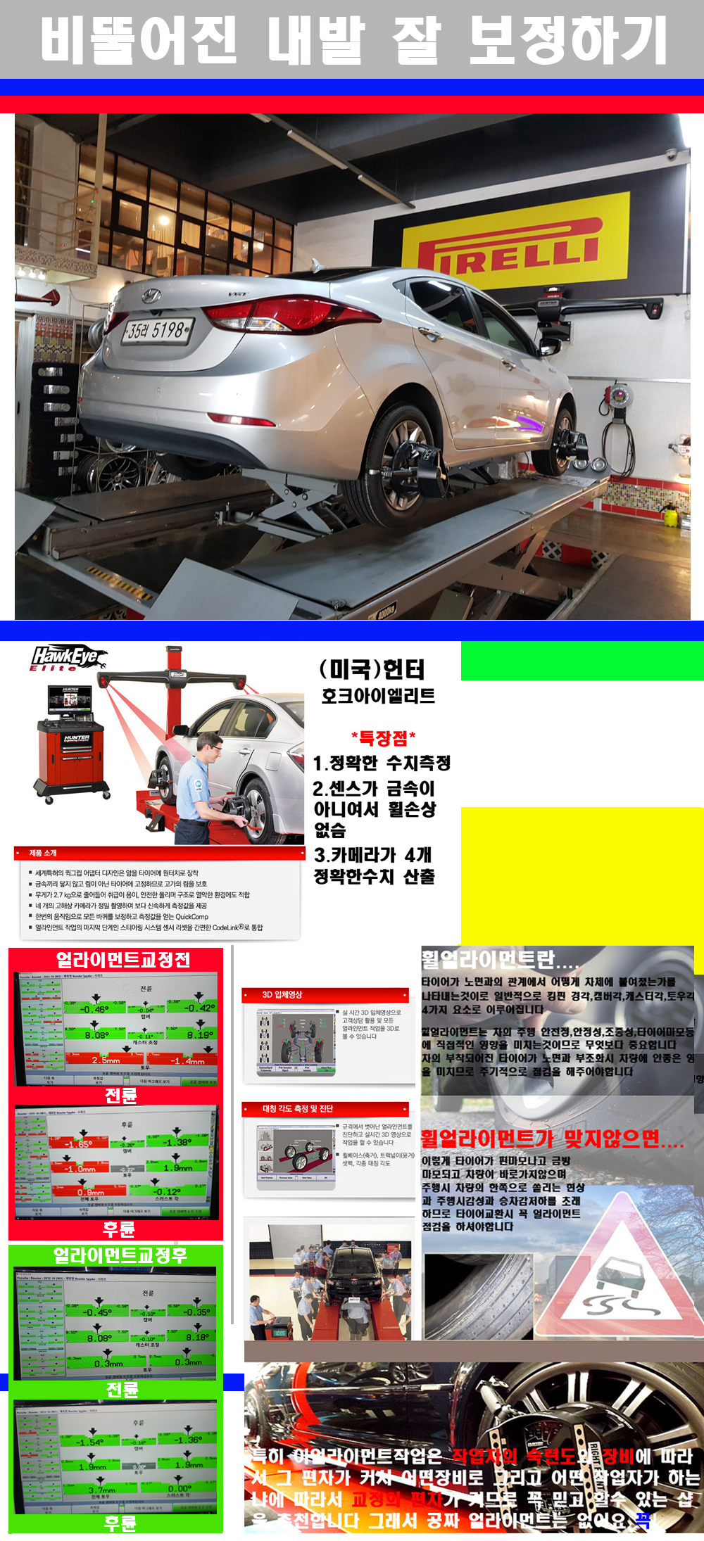 자사는 얼라이먼트정렬시 교정전 교정후를 구분하여 고객님께 직접 이수치값을 확인시켜드리고 작업을 하며 이후 각각의 특성을 가진 타이어들에 대해서 설명 및 관리요령 운전요령 같이 설명해드리고 있습니다
