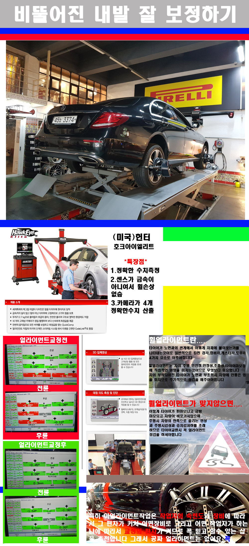 자사는 얼라이먼트정렬시 교정전 교정후를 구분하여 고객님께 직접 이수치값을 확인시켜드리고 작업을 하며 이후 각각의 특성을 가진 타이어들에 대해서 설명 및 관리요령 운전요령 같이 설명해드리고 있습니다