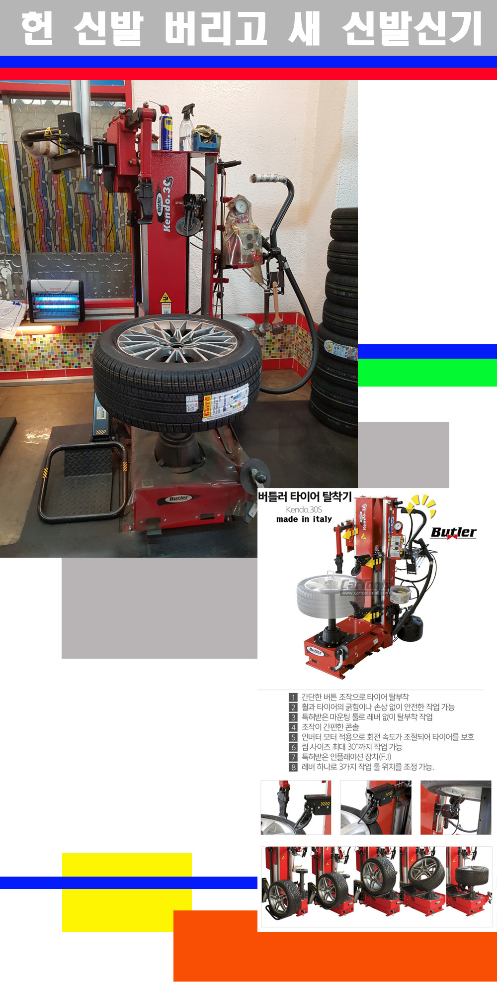 이태리 버틀러사의 켄도3.0S는 휠과 타이어와 조립과 분리시 전혀 제품에 손상을 주지않는 탈착기로 특히 센터락방식(중앙에서 휠를 고정하는 방식)이여서 휠의 중앙부위 잡아서 타이어를 탈부착하고 이후 상하롤러로 타이어를 탈부착합니다 특히 유니포미티작업(휠의 가장가벼운부분과 타이어의 가장 무거운부분을 매칭시키는 작업)시 작업자가 타이어를 정확한 지점에 휠과 매칭시킬수 있는 장점도 있습니다
