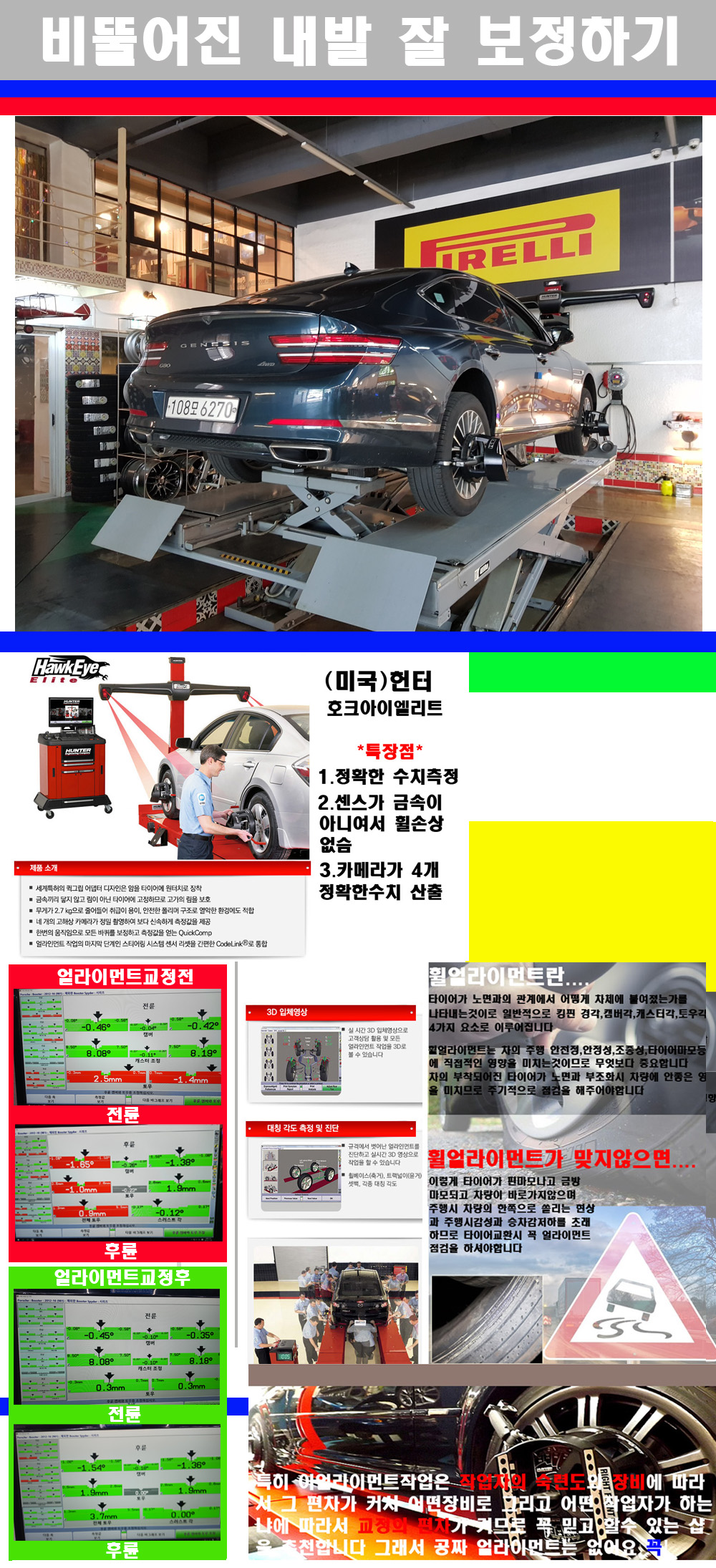 자사는 얼라이먼트정렬시 교정전 교정후를 구분하여 고객님께 직접 이수치값을 확인시켜드리고 작업을 하며 이후 각각의 특성을 가진 타이어들에 대해서 설명 및 관리요령 운전요령 같이 설명해드리고 있습니다