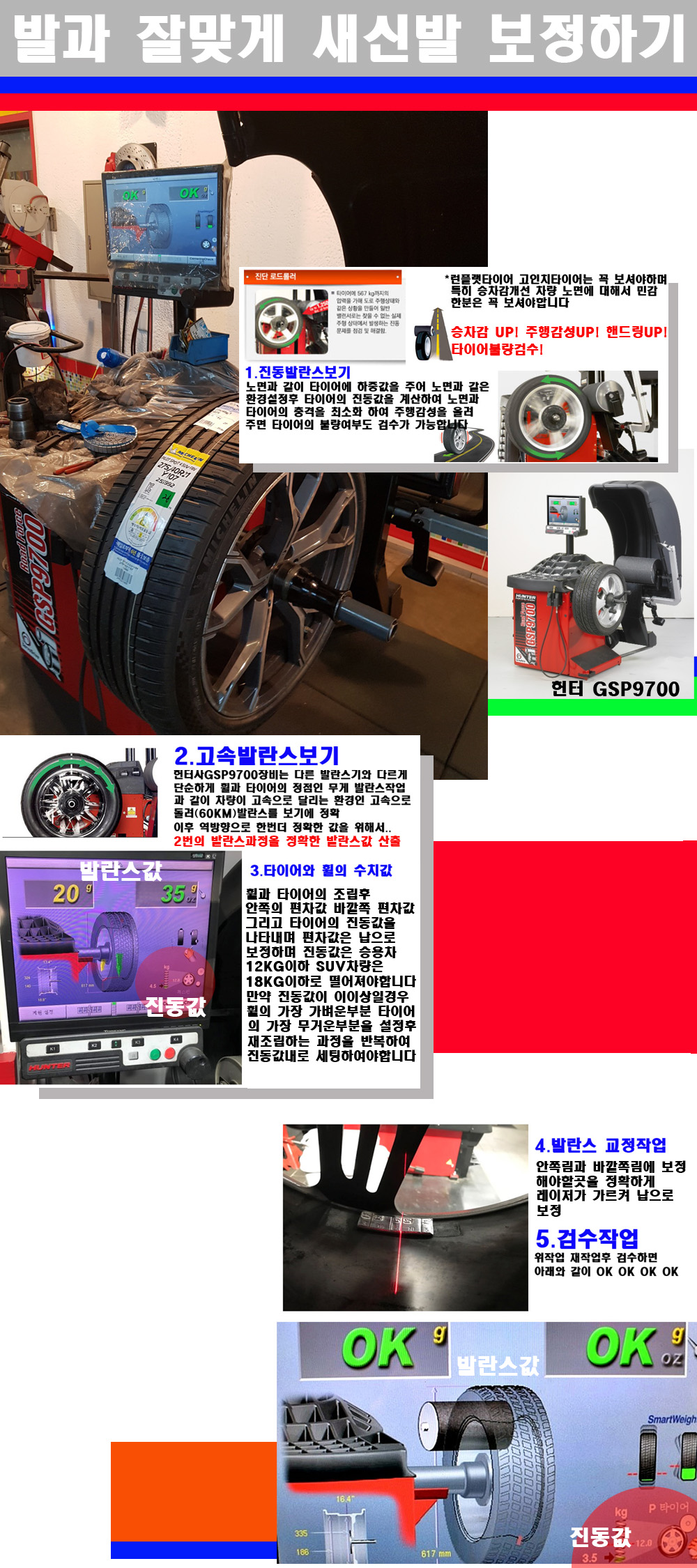 그리고 작업자에게는 불필요한 발란스납을 붙이지 않아 미관상으로 좋고 납을 절약하는 고객님에게도윈이고 작업자에게도 윈윈할수 있는 장비입니다 그리고 시중에서 고속진동발란스라고 말하시는 샵들이 많은데 꼭아셔야하는것은 고속발란스는 말그대로 발란스를 볼때 고속으로 돌리기에 60키로 전후 그리고 진동값을 계산하기위해서는 발란스기에 진동롤러가 있어야합니다 그래서 미국헌터사 GSP9700장비가 유일합니다 다른 샵에서 말하는 발란스기는 고속진동발란스기능없는 일반발란스 기기입니다 이점 꼭 아시고 장착하시기를 바랍니다