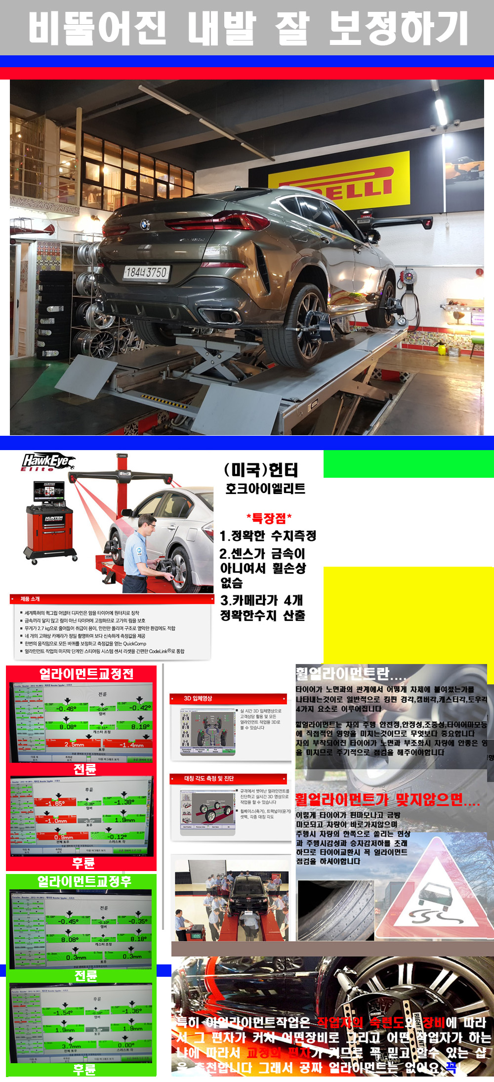 자사는 얼라이먼트정렬시 교정전 교정후를 구분하여 고객님께 직접 이수치값을 확인시켜드리고 작업을 하며 이후 각각의 특성을 가진 타이어들에 대해서 설명 및 관리요령 운전요령 같이 설명해드리고 있습니다