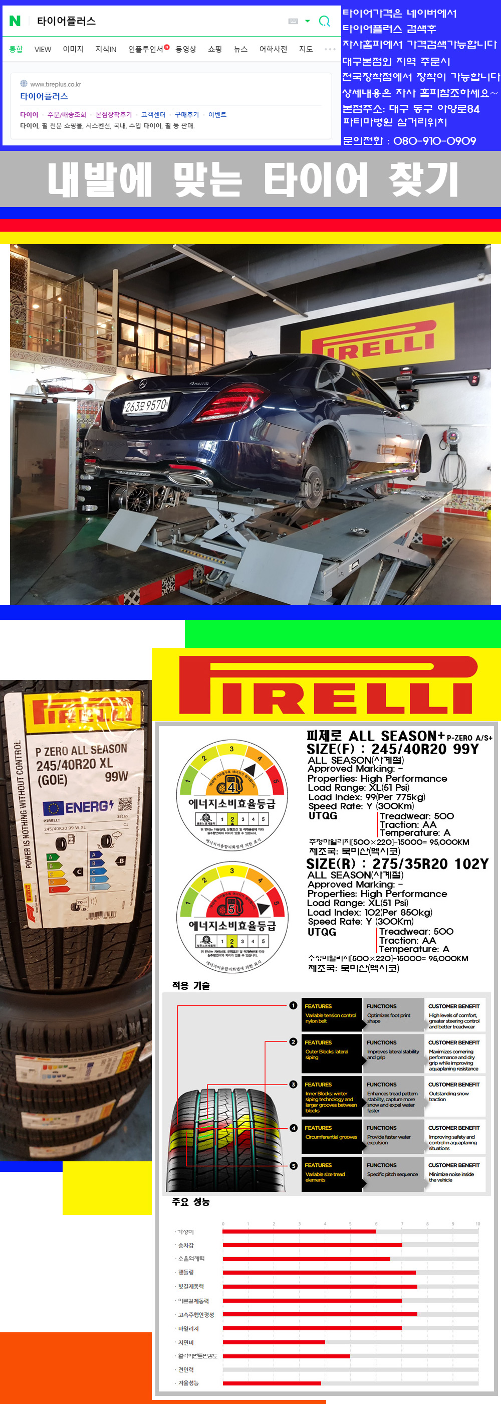 물론 한국 금호 넥센 브리지스톤 미쉐린 콘티넨탈 피렐리 던롭 굳이어 요코하마 등 세계유수의 10대 브랜드타이어만 취급하고 있습니다 타이어매장중 단일규모로는 아마 전국에서 제일 커지않을까 생각합니다 가격도 인터넷 최저가로 장착해 드리고 있습니다 고객님들이 오시면서 너무 고급스러워 가격도 비싸지 않을까 생각하시는데 네이버에서 타이어플러스사이트를 검색해보시면 가격 또한 정말 싸게 판매하고 있구나 하고 생각하실것입니다 물론 장비도 현존하는 장비중 가장 최신장비와 그리고 유럽풍 인테리어의 최고급매장입니다 무엇하나 정품만 취급하며 작업또한 꼼꼼하게 매뉴얼에 따라서 작업을 해드립니다 특히 사장님의 이력이 화려한데 자동차경주 레이스와 미캐닉 국제자격증(A)소지자로서 경험한 풍부한 자동차의 지식을 갖춘분이십니다 특히 자동차잡지사에 타이어에 관한 내용도 기재하신 분이며 타이어회사의 타이어테스트드라이브로도 참여한 분이십니다 제품의 품질이나 제품의 성능등을 장사수단으로 말하지 않고 있는 그대로 말해드리며 특히 사장님 성격상 거짓말을 못하는 성격이여서 믿고 맡겨주시면 후회하지 않을 것입니다 그래서 사장님께서 직접상담해주시고 장착도 해주시는 매장이기에 더 신뢰가 가지 않을까 생각합니다 자사는 인터넷 최저가 기반으로 성장한 회사이기에 가격또한 인터넷 최저가로 장착해 드리고 있습니다 그리고 자사는 고객만족도에서 대상까지 수상한 회사입니다 그래서 한번 저의 매장에서 작업하신 고객님은 아마 다른곳에서는 아마 눈에 차지 않을것이라 생각합니다 가격이면 가격 작업의 완성도면 완성도 그리고 사후 관리까지 최고중에 최고가 되기위해서 노력하는 매장입니다 지금까지 어느 매장에서도 느끼지 못한 감성들을 느끼시기를 바랍니다 감사합니다