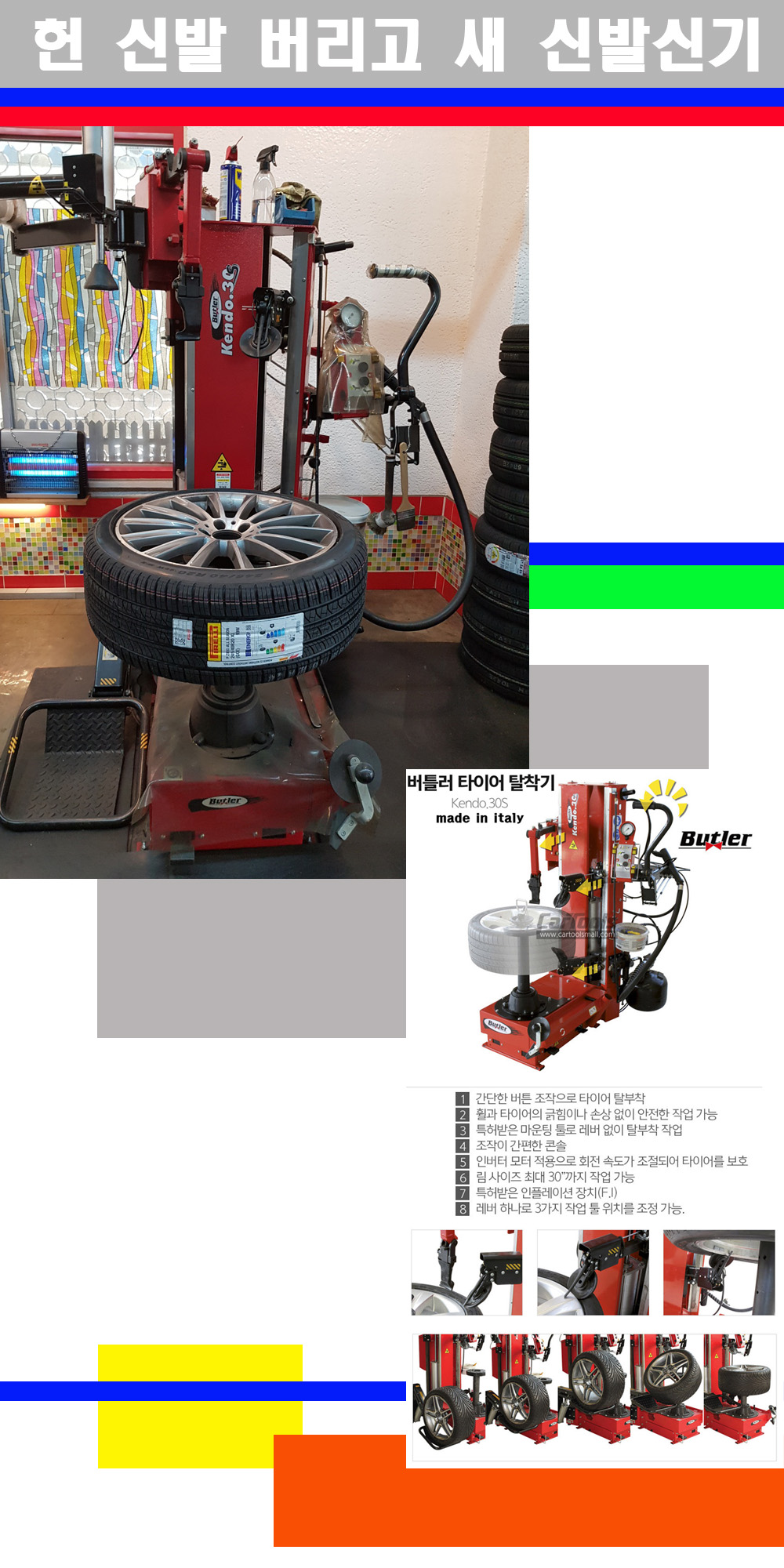 이태리 버틀러사의 켄도3.0S는 휠과 타이어와 조립과 분리시 전혀 제품에 손상을 주지않는 탈착기로 특히 센터락방식(중앙에서 휠를 고정하는 방식)이여서 휠의 중앙부위 잡아서 타이어를 탈부착하고 이후 상하롤러로 타이어를 탈부착합니다 특히 유니포미티작업(휠의 가장가벼운부분과 타이어의 가장 무거운부분을 매칭시키는 작업)시 작업자가 타이어를 정확한 지점에 휠과 매칭시킬수 있는 장점도 있습니다