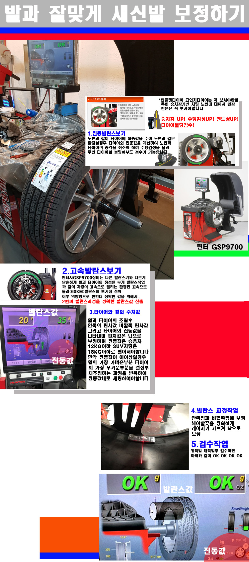 그리고 작업자에게는 불필요한 발란스납을 붙이지 않아 미관상으로 좋고 납을 절약하는 고객님에게도윈이고 작업자에게도 윈윈할수 있는 장비입니다 그리고 시중에서 고속진동발란스라고 말하시는 샵들이 많은데 꼭아셔야하는것은 고속발란스는 말그대로 발란스를 볼때 고속으로 돌리기에 60키로 전후 그리고 진동값을 계산하기위해서는 발란스기에 진동롤러가 있어야합니다 그래서 미국헌터사 GSP9700장비가 유일합니다 다른 샵에서 말하는 발란스기는 고속진동발란스기능없는 일반발란스 기기입니다 이점 꼭 아시고 장착하시기를 바랍니다
