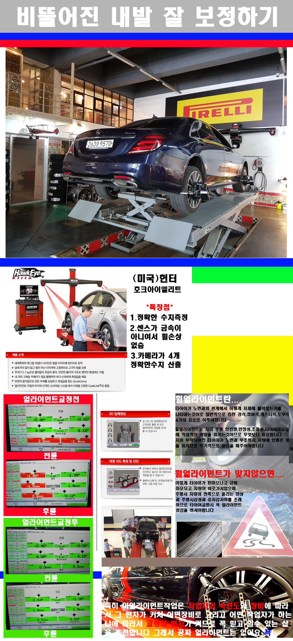 자사는 얼라이먼트정렬시 교정전 교정후를 구분하여 고객님께 직접 이수치값을 확인시켜드리고 작업을 하며 이후 각각의 특성을 가진 타이어들에 대해서 설명 및 관리요령 운전요령 같이 설명해드리고 있습니다