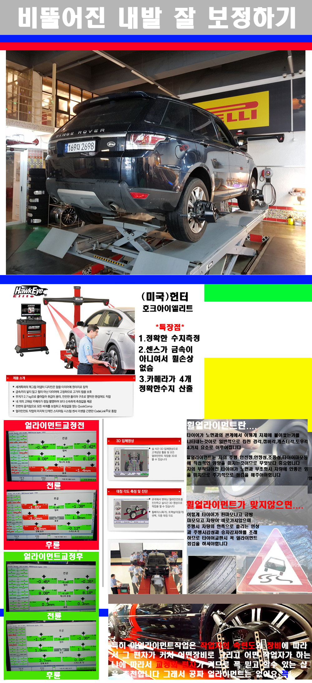 자사는 얼라이먼트정렬시 교정전 교정후를 구분하여 고객님께 직접 이수치값을 확인시켜드리고 작업을 하며 이후 각각의 특성을 가진 타이어들에 대해서 설명 및 관리요령 운전요령 같이 설명해드리고 있습니다