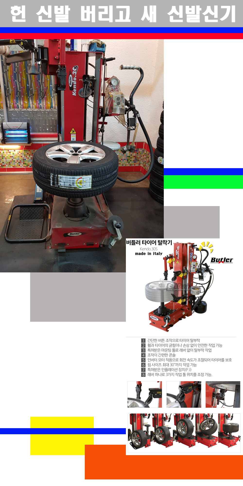 이태리 버틀러사의 켄도3.0S는 휠과 타이어와 조립과 분리시 전혀 제품에 손상을 주지않는 탈착기로 특히 센터락방식(중앙에서 휠를 고정하는 방식)이여서 휠의 중앙부위 잡아서 타이어를 탈부착하고 이후 상하롤러로 타이어를 탈부착합니다 특히 유니포미티작업(휠의 가장가벼운부분과 타이어의 가장 무거운부분을 매칭시키는 작업)시 작업자가 타이어를 정확한 지점에 휠과 매칭시킬수 있는 장점도 있습니다