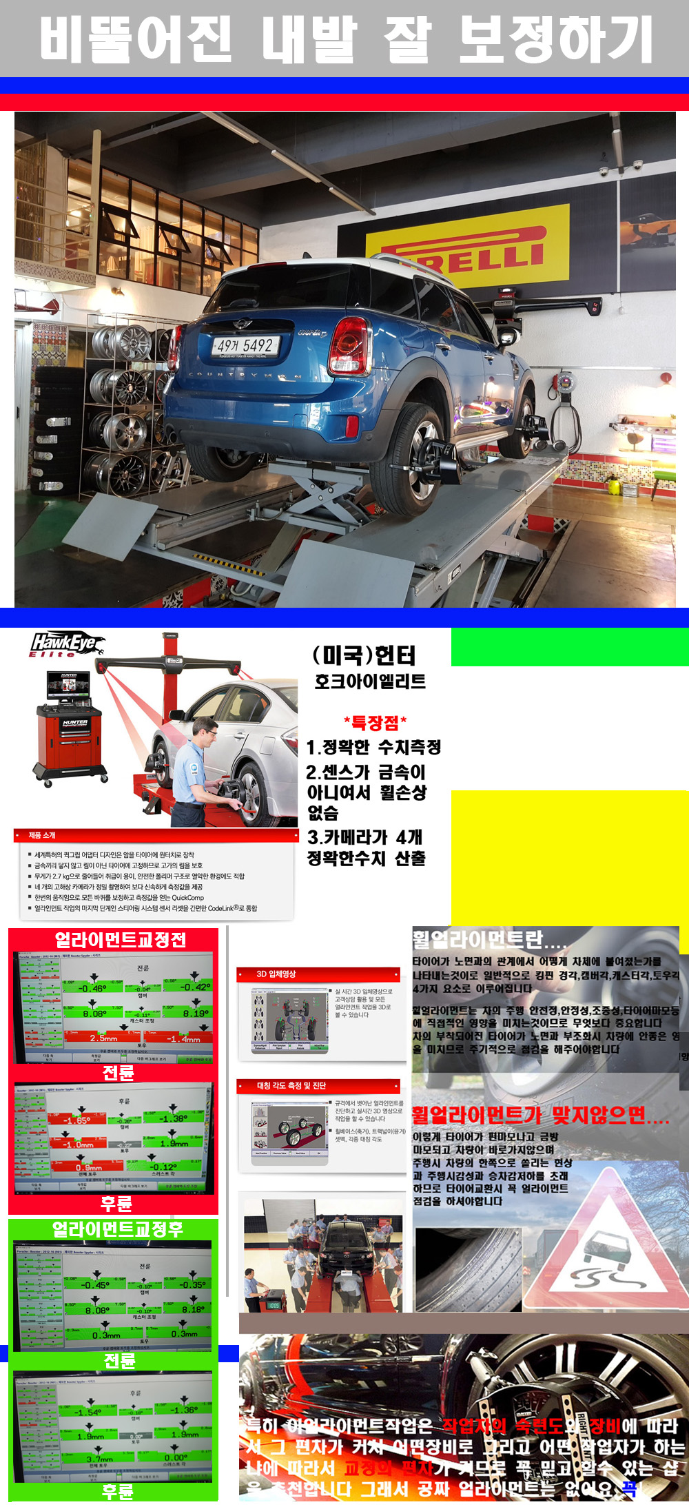 자사는 얼라이먼트정렬시 교정전 교정후를 구분하여 고객님께 직접 이수치값을 확인시켜드리고 작업을 하며 이후 각각의 특성을 가진 타이어들에 대해서 설명 및 관리요령 운전요령 같이 설명해드리고 있습니다