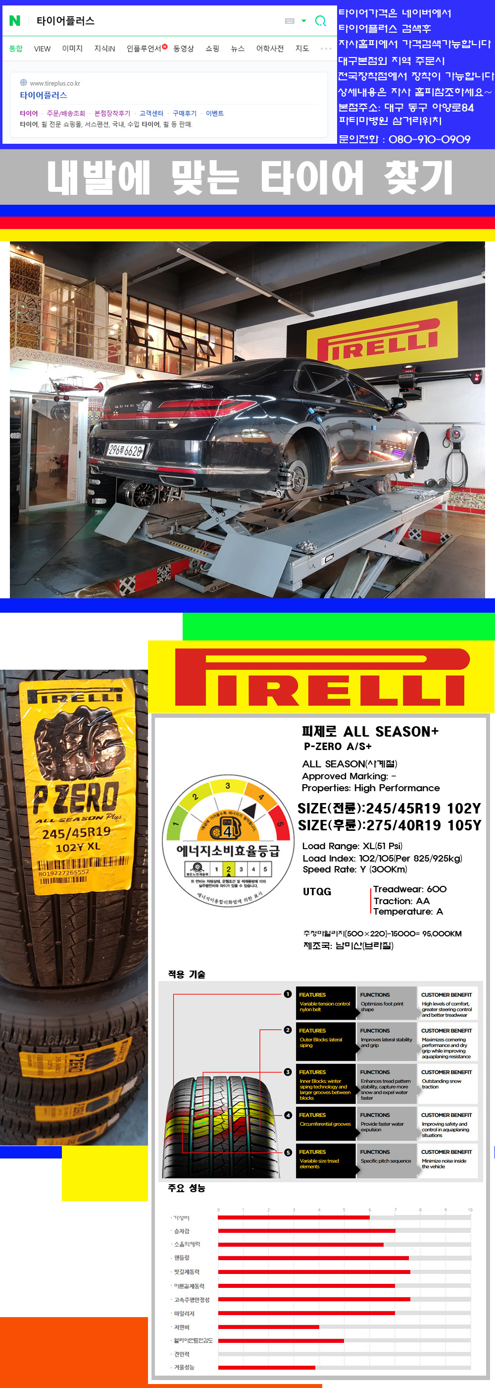 물론 한국 금호 넥센 브리지스톤 미쉐린 콘티넨탈 피렐리 던롭 굳이어 요코하마 등 세계유수의 10대 브랜드타이어만 취급하고 있습니다 타이어매장중 단일규모로는 아마 전국에서 제일 커지않을까 생각합니다 가격도 인터넷 최저가로 장착해 드리고 있습니다 고객님들이 오시면서 너무 고급스러워 가격도 비싸지 않을까 생각하시는데 네이버에서 타이어플러스사이트를 검색해보시면 가격 또한 정말 싸게 판매하고 있구나 하고 생각하실것입니다 물론 장비도 현존하는 장비중 가장 최신장비와 그리고 유럽풍 인테리어의 최고급매장입니다 무엇하나 정품만 취급하며 작업또한 꼼꼼하게 매뉴얼에 따라서 작업을 해드립니다 특히 사장님의 이력이 화려한데 자동차경주 레이스와 미캐닉 국제자격증(A)소지자로서 경험한 풍부한 자동차의 지식을 갖춘분이십니다 특히 자동차잡지사에 타이어에 관한 내용도 기재하신 분이며 타이어회사의 타이어테스트드라이브로도 참여한 분이십니다 제품의 품질이나 제품의 성능등을 장사수단으로 말하지 않고 있는 그대로 말해드리며 특히 사장님 성격상 거짓말을 못하는 성격이여서 믿고 맡겨주시면 후회하지 않을 것입니다 그래서 사장님께서 직접상담해주시고 장착도 해주시는 매장이기에 더 신뢰가 가지 않을까 생각합니다 자사는 인터넷 최저가 기반으로 성장한 회사이기에 가격또한 인터넷 최저가로 장착해 드리고 있습니다 그리고 자사는 고객만족도에서 대상까지 수상한 회사입니다 그래서 한번 저의 매장에서 작업하신 고객님은 아마 다른곳에서는 아마 눈에 차지 않을것이라 생각합니다 가격이면 가격 작업의 완성도면 완성도 그리고 사후 관리까지 최고중에 최고가 되기위해서 노력하는 매장입니다 지금까지 어느 매장에서도 느끼지 못한 감성들을 느끼시기를 바랍니다 감사합니다