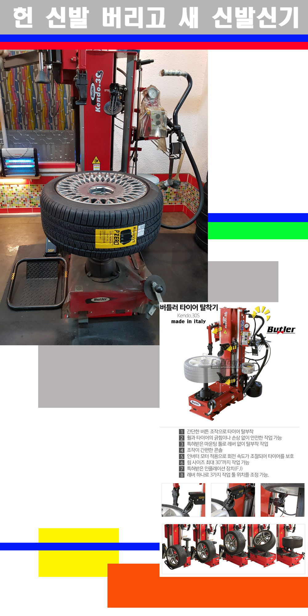 이태리 버틀러사의 켄도3.0S는 휠과 타이어와 조립과 분리시 전혀 제품에 손상을 주지않는 탈착기로 특히 센터락방식(중앙에서 휠를 고정하는 방식)이여서 휠의 중앙부위 잡아서 타이어를 탈부착하고 이후 상하롤러로 타이어를 탈부착합니다 특히 유니포미티작업(휠의 가장가벼운부분과 타이어의 가장 무거운부분을 매칭시키는 작업)시 작업자가 타이어를 정확한 지점에 휠과 매칭시킬수 있는 장점도 있습니다