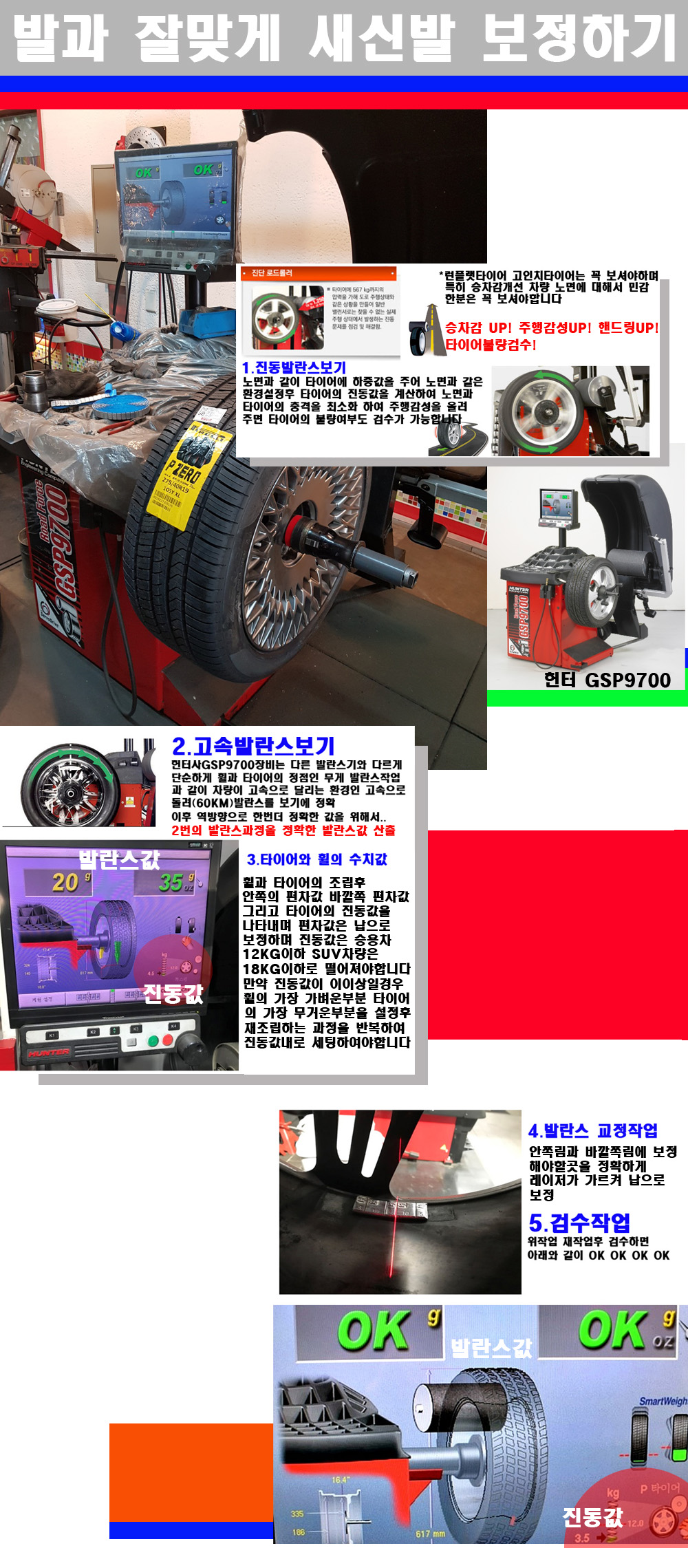 그리고 작업자에게는 불필요한 발란스납을 붙이지 않아 미관상으로 좋고 납을 절약하는 고객님에게도윈이고 작업자에게도 윈윈할수 있는 장비입니다 그리고 시중에서 고속진동발란스라고 말하시는 샵들이 많은데 꼭아셔야하는것은 고속발란스는 말그대로 발란스를 볼때 고속으로 돌리기에 60키로 전후 그리고 진동값을 계산하기위해서는 발란스기에 진동롤러가 있어야합니다 그래서 미국헌터사 GSP9700장비가 유일합니다 다른 샵에서 말하는 발란스기는 고속진동발란스기능없는 일반발란스 기기입니다 이점 꼭 아시고 장착하시기를 바랍니다