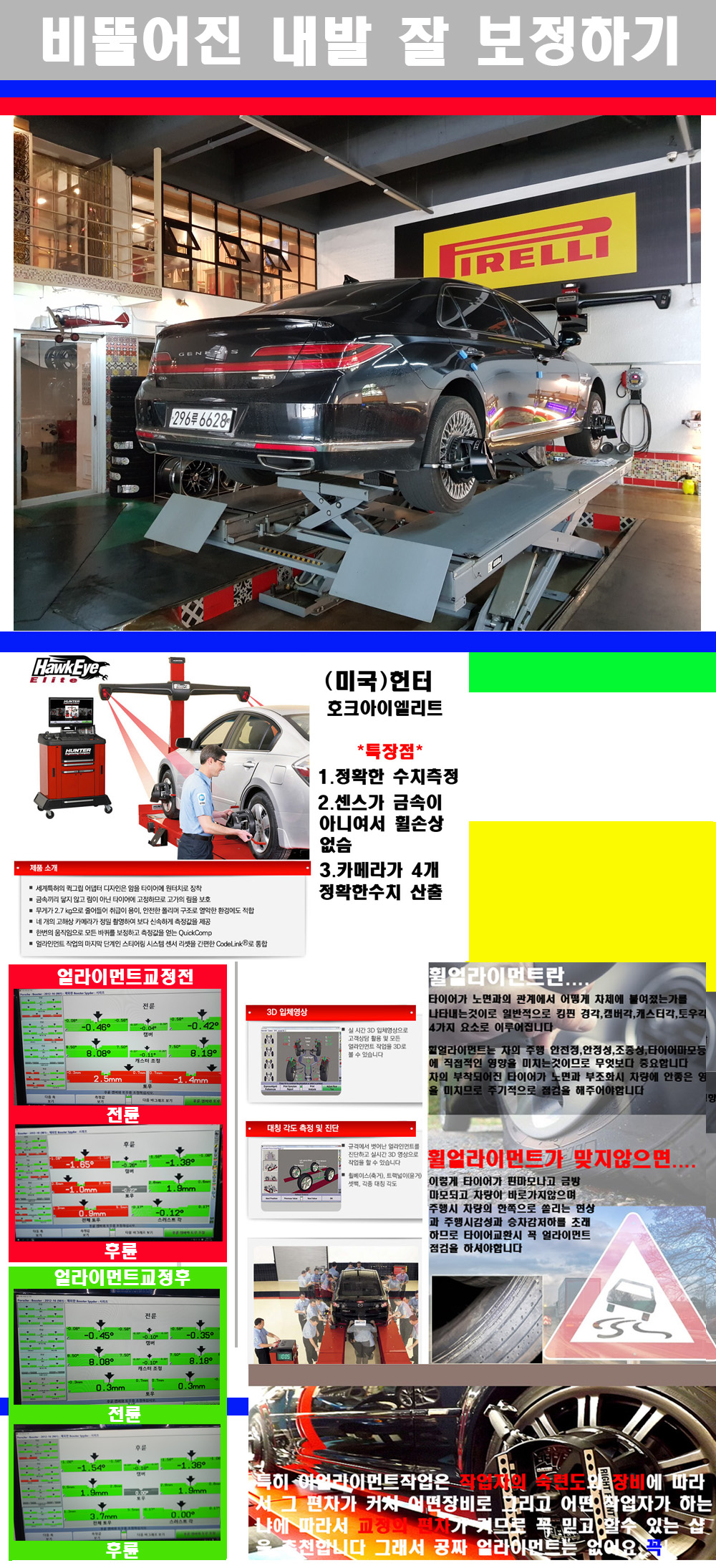 자사는 얼라이먼트정렬시 교정전 교정후를 구분하여 고객님께 직접 이수치값을 확인시켜드리고 작업을 하며 이후 각각의 특성을 가진 타이어들에 대해서 설명 및 관리요령 운전요령 같이 설명해드리고 있습니다