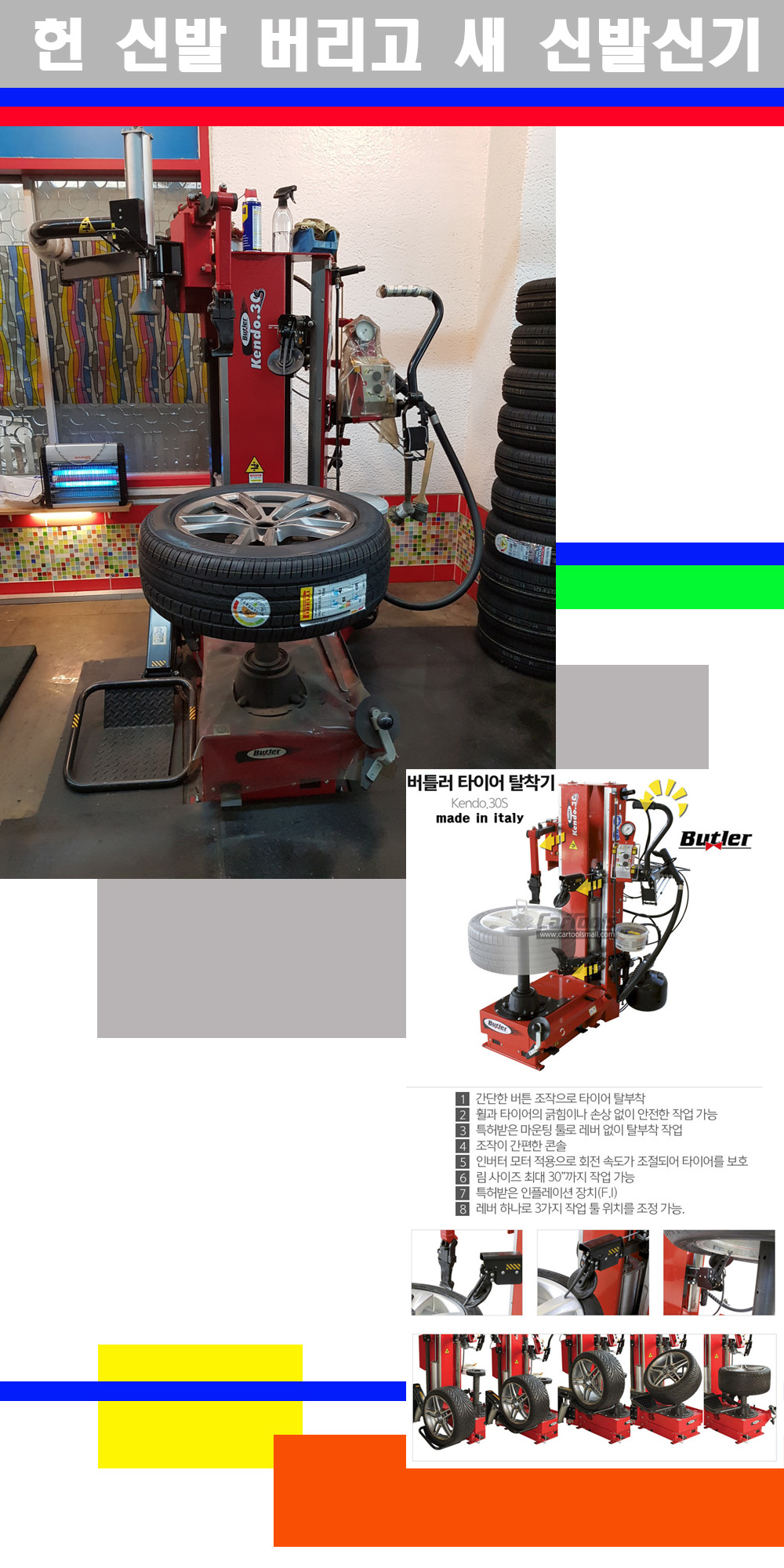 이태리 버틀러사의 켄도3.0S는 휠과 타이어와 조립과 분리시 전혀 제품에 손상을 주지않는 탈착기로 특히 센터락방식(중앙에서 휠를 고정하는 방식)이여서 휠의 중앙부위 잡아서 타이어를 탈부착하고 이후 상하롤러로 타이어를 탈부착합니다 특히 유니포미티작업(휠의 가장가벼운부분과 타이어의 가장 무거운부분을 매칭시키는 작업)시 작업자가 타이어를 정확한 지점에 휠과 매칭시킬수 있는 장점도 있습니다
