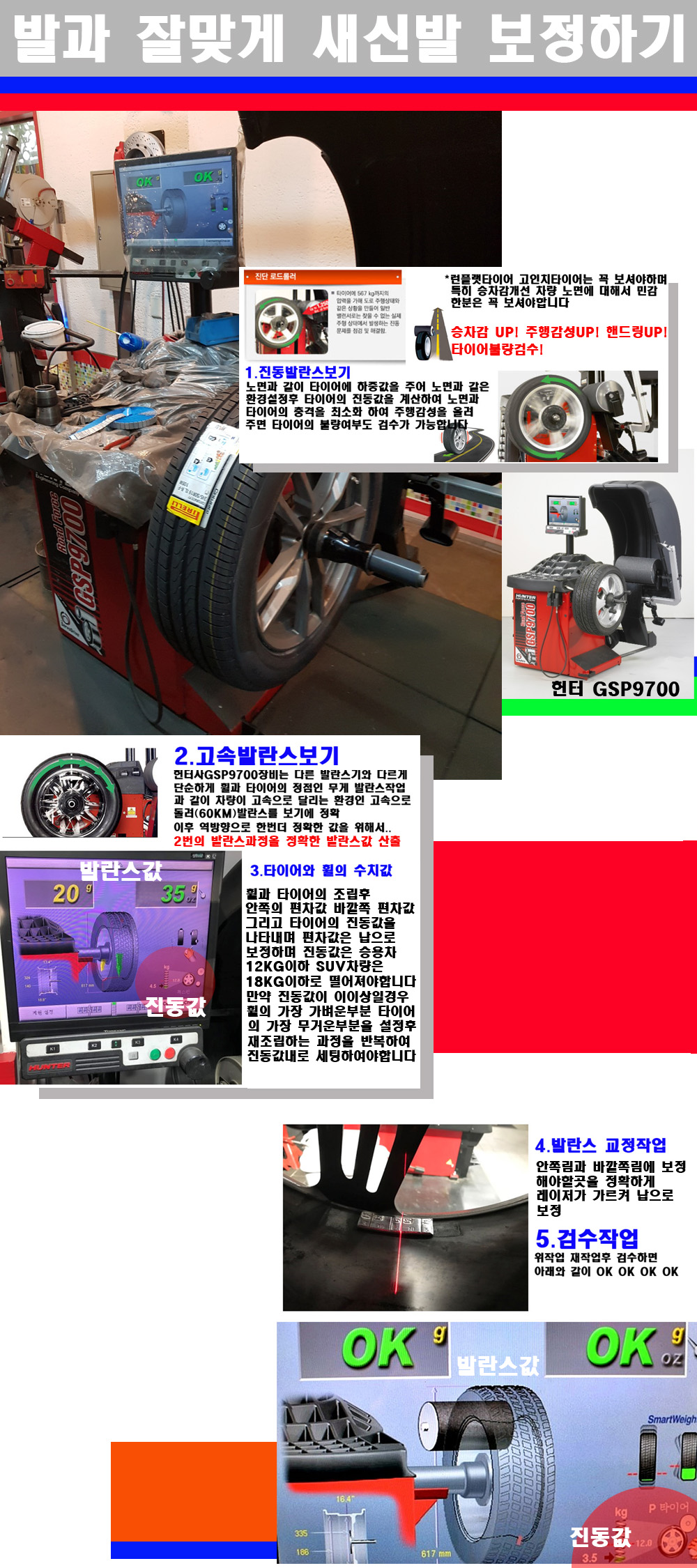 그리고 작업자에게는 불필요한 발란스납을 붙이지 않아 미관상으로 좋고 납을 절약하는 고객님에게도윈이고 작업자에게도 윈윈할수 있는 장비입니다 그리고 시중에서 고속진동발란스라고 말하시는 샵들이 많은데 꼭아셔야하는것은 고속발란스는 말그대로 발란스를 볼때 고속으로 돌리기에 60키로 전후 그리고 진동값을 계산하기위해서는 발란스기에 진동롤러가 있어야합니다 그래서 미국헌터사 GSP9700장비가 유일합니다 다른 샵에서 말하는 발란스기는 고속진동발란스기능없는 일반발란스 기기입니다 이점 꼭 아시고 장착하시기를 바랍니다