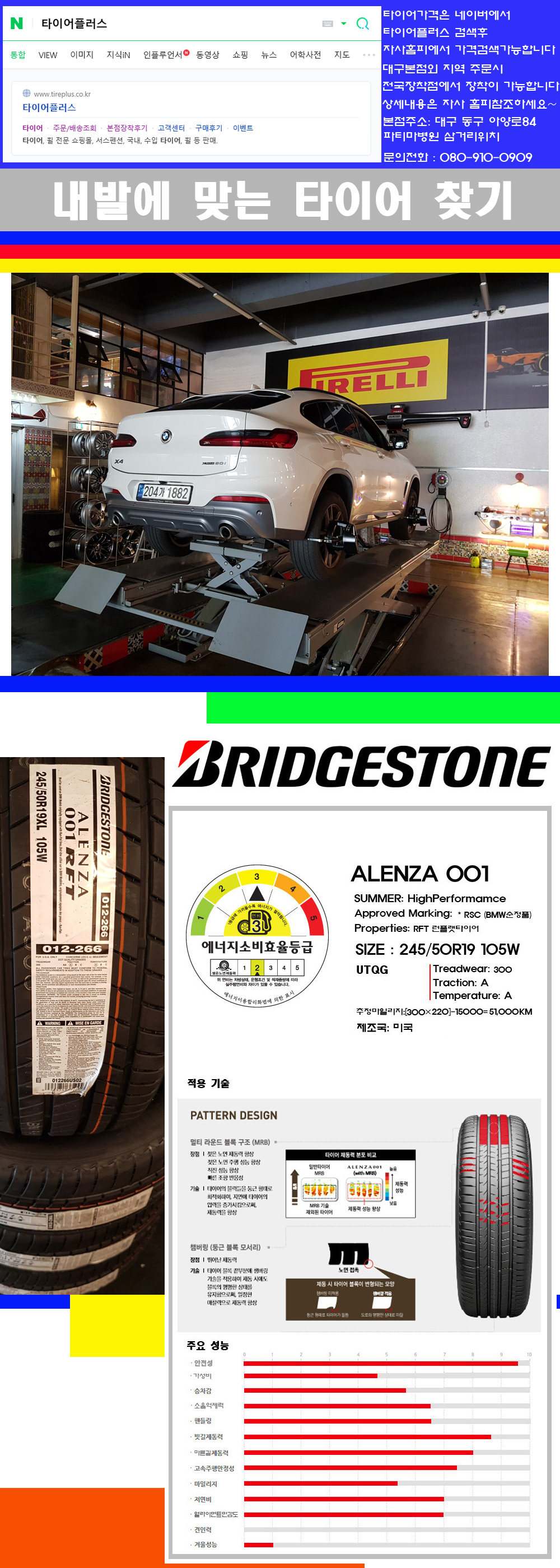 물론 한국 금호 넥센 브리지스톤 미쉐린 콘티넨탈 피렐리 던롭 굳이어 요코하마 등 세계유수의 10대 브랜드타이어만 취급하고 있습니다 타이어매장중 단일규모로는 아마 전국에서 제일 커지않을까 생각합니다 가격도 인터넷 최저가로 장착해 드리고 있습니다 고객님들이 오시면서 너무 고급스러워 가격도 비싸지 않을까 생각하시는데 네이버에서 타이어플러스사이트를 검색해보시면 가격 또한 정말 싸게 판매하고 있구나 하고 생각하실것입니다 물론 장비도 현존하는 장비중 가장 최신장비와 그리고 유럽풍 인테리어의 최고급매장입니다 무엇하나 정품만 취급하며 작업또한 꼼꼼하게 매뉴얼에 따라서 작업을 해드립니다 특히 사장님의 이력이 화려한데 자동차경주 레이스와 미캐닉 국제자격증(A)소지자로서 경험한 풍부한 자동차의 지식을 갖춘분이십니다 특히 자동차잡지사에 타이어에 관한 내용도 기재하신 분이며 타이어회사의 타이어테스트드라이브로도 참여한 분이십니다 제품의 품질이나 제품의 성능등을 장사수단으로 말하지 않고 있는 그대로 말해드리며 특히 사장님 성격상 거짓말을 못하는 성격이여서 믿고 맡겨주시면 후회하지 않을 것입니다 그래서 사장님께서 직접상담해주시고 장착도 해주시는 매장이기에 더 신뢰가 가지 않을까 생각합니다 자사는 인터넷 최저가 기반으로 성장한 회사이기에 가격또한 인터넷 최저가로 장착해 드리고 있습니다 그리고 자사는 고객만족도에서 대상까지 수상한 회사입니다 그래서 한번 저의 매장에서 작업하신 고객님은 아마 다른곳에서는 아마 눈에 차지 않을것이라 생각합니다 가격이면 가격 작업의 완성도면 완성도 그리고 사후 관리까지 최고중에 최고가 되기위해서 노력하는 매장입니다 지금까지 어느 매장에서도 느끼지 못한 감성들을 느끼시기를 바랍니다 감사합니다