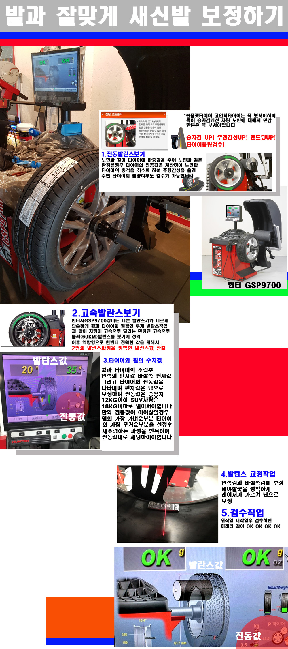 그리고 작업자에게는 불필요한 발란스납을 붙이지 않아 미관상으로 좋고 납을 절약하는 고객님에게도윈이고 작업자에게도 윈윈할수 있는 장비입니다 그리고 시중에서 고속진동발란스라고 말하시는 샵들이 많은데 꼭아셔야하는것은 고속발란스는 말그대로 발란스를 볼때 고속으로 돌리기에 60키로 전후 그리고 진동값을 계산하기위해서는 발란스기에 진동롤러가 있어야합니다 그래서 미국헌터사 GSP9700장비가 유일합니다 다른 샵에서 말하는 발란스기는 고속진동발란스기능없는 일반발란스 기기입니다 이점 꼭 아시고 장착하시기를 바랍니다
