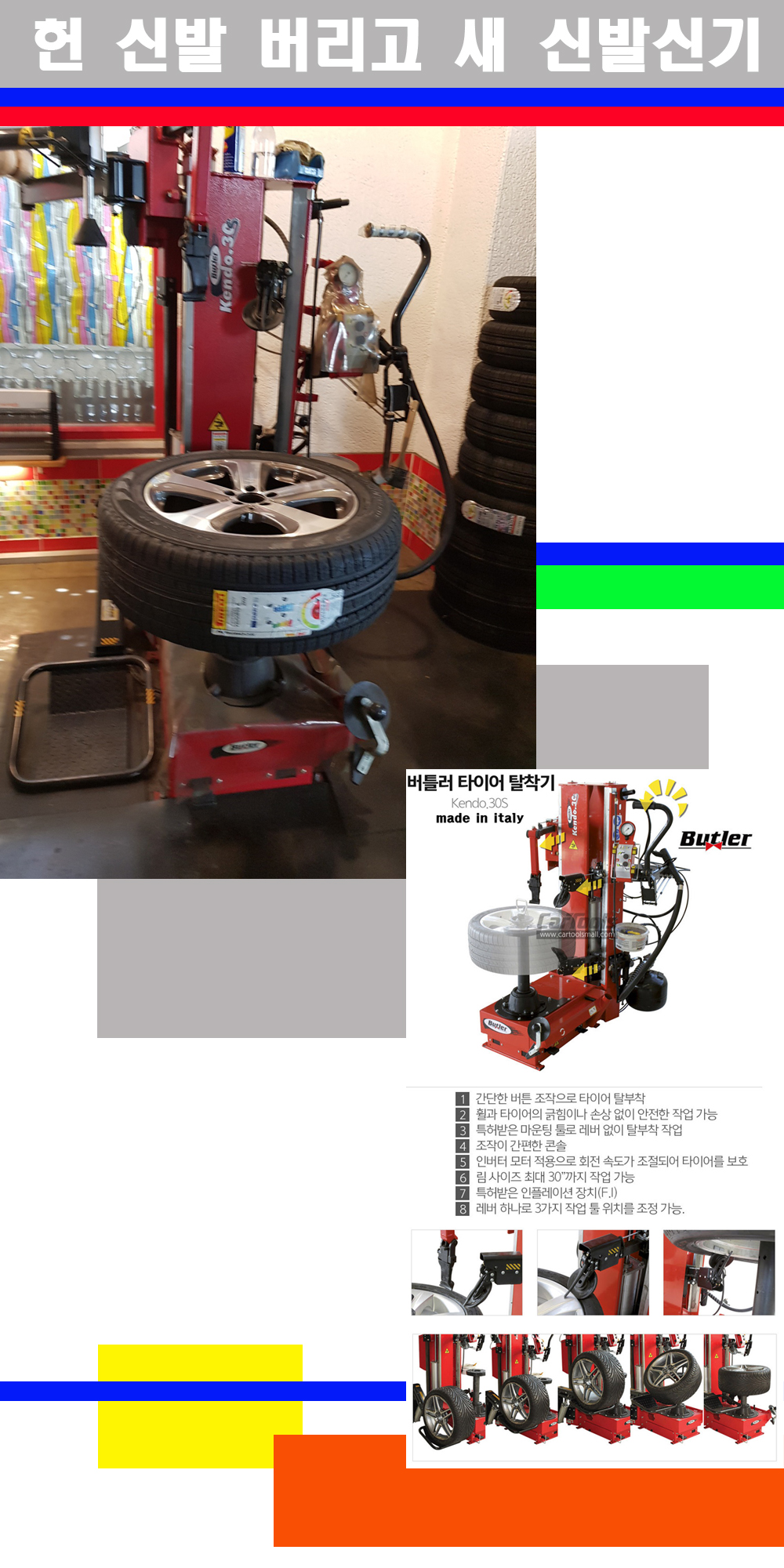 이태리 버틀러사의 켄도3.0S는 휠과 타이어와 조립과 분리시 전혀 제품에 손상을 주지않는 탈착기로 특히 센터락방식(중앙에서 휠를 고정하는 방식)이여서 휠의 중앙부위 잡아서 타이어를 탈부착하고 이후 상하롤러로 타이어를 탈부착합니다 특히 유니포미티작업(휠의 가장가벼운부분과 타이어의 가장 무거운부분을 매칭시키는 작업)시 작업자가 타이어를 정확한 지점에 휠과 매칭시킬수 있는 장점도 있습니다