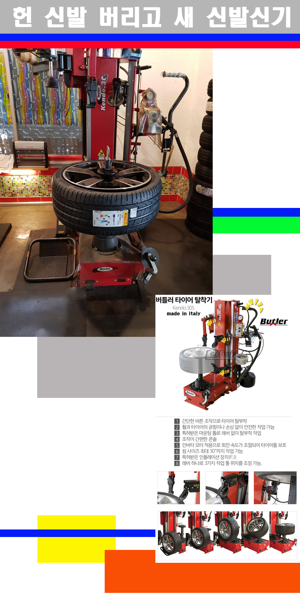이태리 버틀러사의 켄도3.0S는 휠과 타이어와 조립과 분리시 전혀 제품에 손상을 주지않는 탈착기로 특히 센터락방식(중앙에서 휠를 고정하는 방식)이여서 휠의 중앙부위 잡아서 타이어를 탈부착하고 이후 상하롤러로 타이어를 탈부착합니다 특히 유니포미티작업(휠의 가장가벼운부분과 타이어의 가장 무거운부분을 매칭시키는 작업)시 작업자가 타이어를 정확한 지점에 휠과 매칭시킬수 있는 장점도 있습니다
