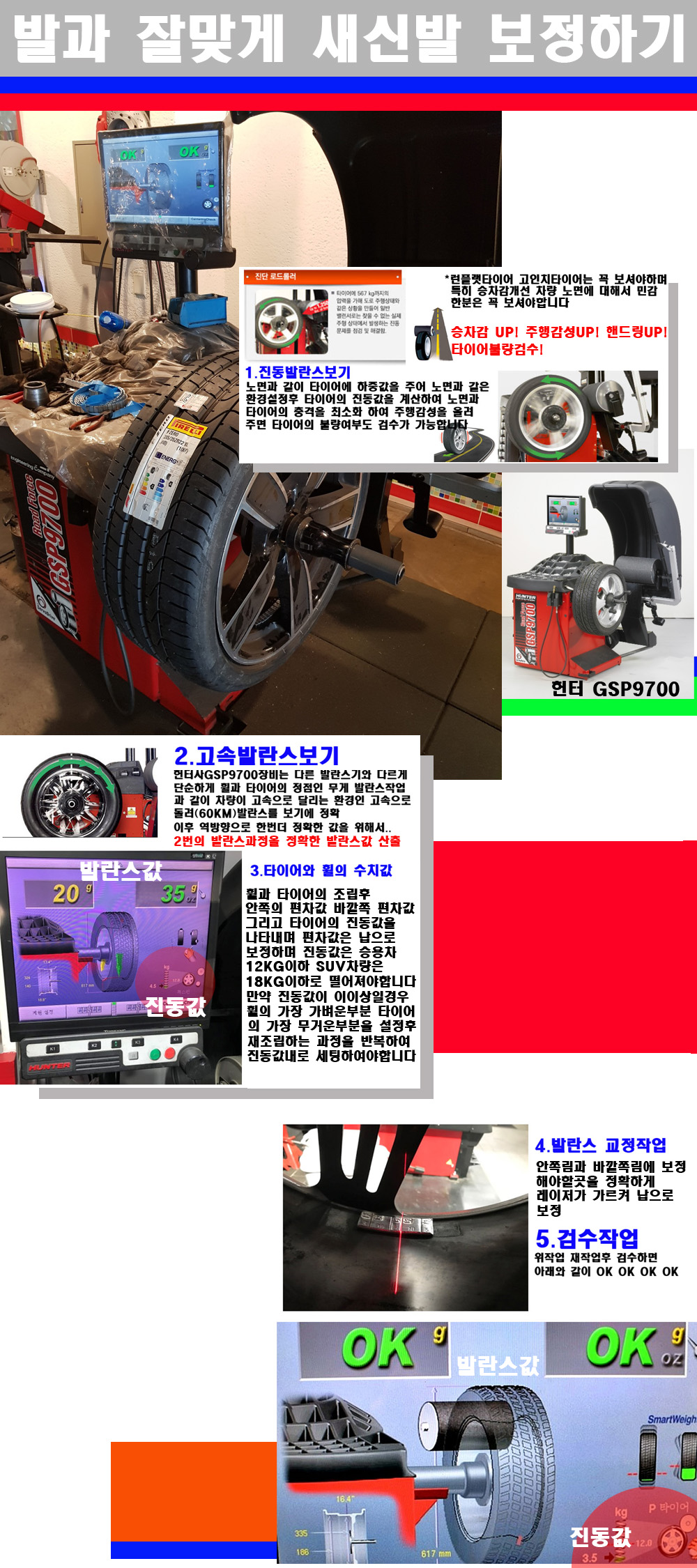 그리고 작업자에게는 불필요한 발란스납을 붙이지 않아 미관상으로 좋고 납을 절약하는 고객님에게도윈이고 작업자에게도 윈윈할수 있는 장비입니다 그리고 시중에서 고속진동발란스라고 말하시는 샵들이 많은데 꼭아셔야하는것은 고속발란스는 말그대로 발란스를 볼때 고속으로 돌리기에 60키로 전후 그리고 진동값을 계산하기위해서는 발란스기에 진동롤러가 있어야합니다 그래서 미국헌터사 GSP9700장비가 유일합니다 다른 샵에서 말하는 발란스기는 고속진동발란스기능없는 일반발란스 기기입니다 이점 꼭 아시고 장착하시기를 바랍니다