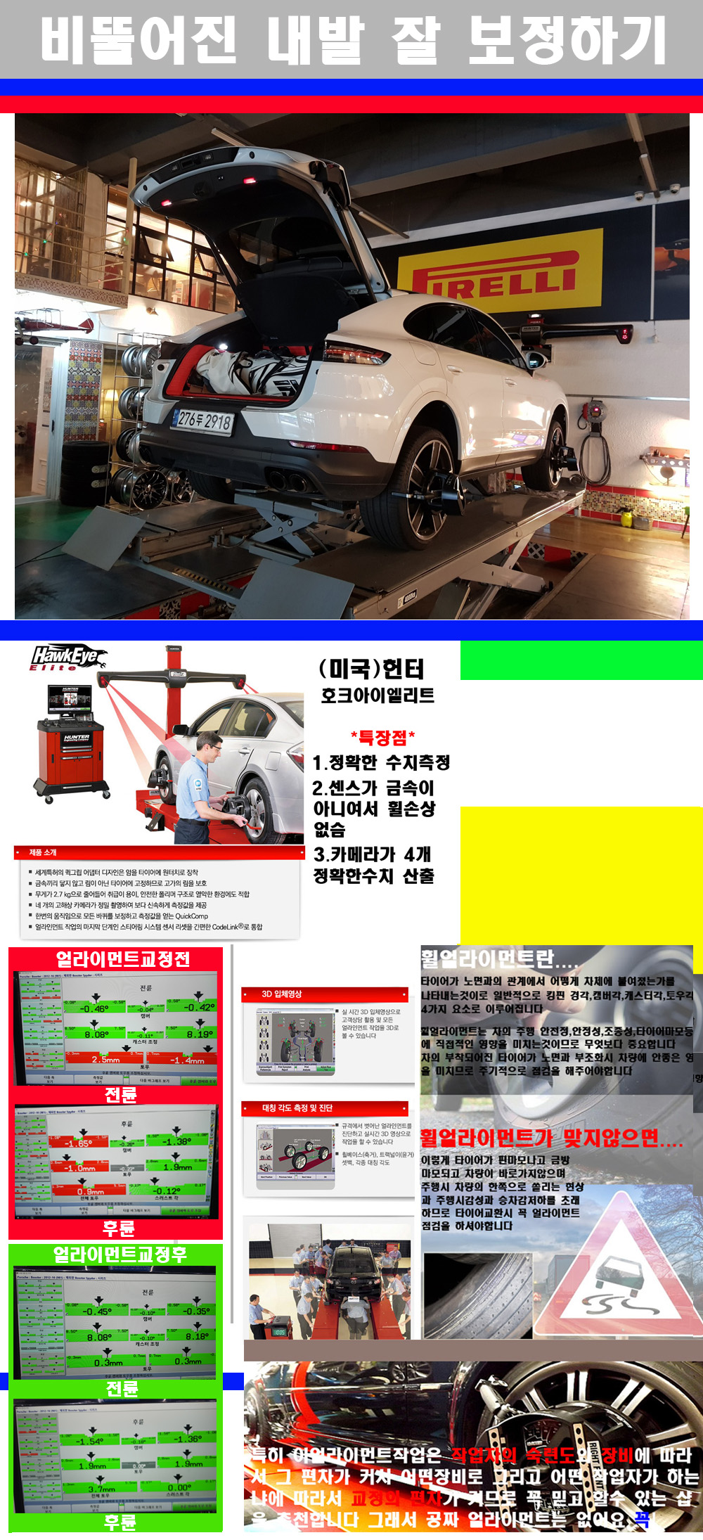 자사는 얼라이먼트정렬시 교정전 교정후를 구분하여 고객님께 직접 이수치값을 확인시켜드리고 작업을 하며 이후 각각의 특성을 가진 타이어들에 대해서 설명 및 관리요령 운전요령 같이 설명해드리고 있습니다