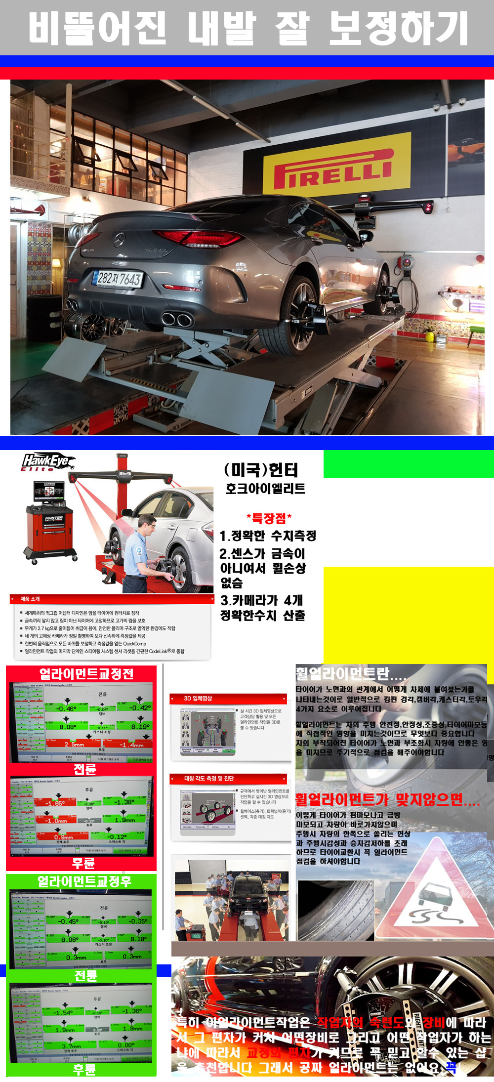 자사는 얼라이먼트정렬시 교정전 교정후를 구분하여 고객님께 직접 이수치값을 확인시켜드리고 작업을 하며 이후 각각의 특성을 가진 타이어들에 대해서 설명 및 관리요령 운전요령 같이 설명해드리고 있습니다