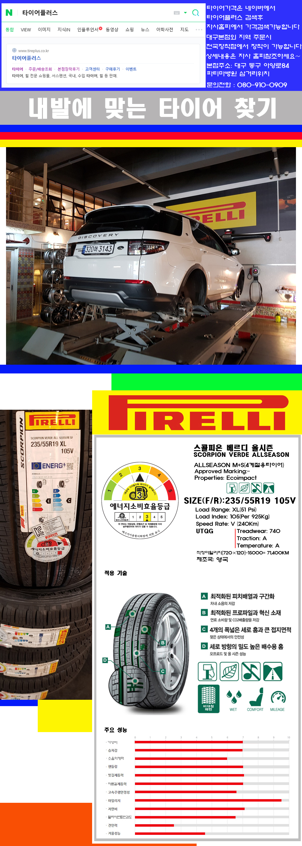 ♥♥♥본점 대구 동구 아양로84 (파티마삼거리 위치) 국산 수입타이어 할인행사중♥♥♥ 이벤트:수입차량 순정품타이어 4개장착시 질소주입 고속진동발란스 얼라이먼트 무료해드리고 있습니다 작업옵션으로 작업비 12만원정도 되는 작업입니다 감사합니다 타이어플러스 대구본점은 전국에서 가장 규모가 큰매장입니다 물론 자사는 지하층 지상4층건물이며 1층작업장이외는 모두 창고로 사용중인 회사입니다 대구광역시 동구 아양로84(파티마병원 네거리에 위치)그래서 매장으로 바로 오시면 당일에 바로 장착이 가능합니다 물론 한국 금호 넥센 브리지스톤 미쉐린 콘티넨탈 피렐리 던롭 굳이어 요코하마 등 세계유수의 10대 브랜드타이어만 취급하고 있습니다 타이어매장중 단일규모로는 아마 전국에서 제일 커지않을까 생각합니다 가격도 인터넷 최저가로 장착해 드리고 있습니다 고객님들이 오시면서 너무 고급스러워 가격도 비싸지 않을까 생각하시는데 네이버에서 타이어플러스사이트를 검색해보시면 가격 또한 정말 싸게 판매하고 있구나 하고 생각하실것입니다 물론 장비도 현존하는 장비중 가장 최신장비와 그리고 유럽풍 인테리어의 최고급매장입니다 무엇하나 정품만 취급하며 작업또한 꼼꼼하게 매뉴얼에 따라서 작업을 해드립니다 특히 사장님의 이력이 화려한데 자동차경주 레이스와 미캐닉 국제자격증(A)소지자로서 경험한 풍부한 자동차의 지식을 갖춘분이십니다 특히 자동차잡지사에 타이어에 관한 내용도 기재하신 분이며 타이어회사의 타이어테스트드라이브로도 참여한 분이십니다 제품의 품질이나 제품의 성능등을 장사수단으로 말하지 않고 있는 그대로 말해드리며 특히 사장님 성격상 거짓말을 못하는 성격이여서 믿고 맡겨주시면 후회하지 않을 것입니다 그래서 사장님께서 직접상담해주시고 장착도 해주시는 매장이기에 더 신뢰가 가지 않을까 생각합니다 자사는 인터넷 최저가 기반으로 성장한 회사이기에 가격또한 인터넷 최저가로 장착해 드리고 있습니다 그리고 자사는 고객만족도에서 대상까지 수상한 회사입니다 그래서 한번 저의 매장에서 작업하신 고객님은 아마 다른곳에서는 아마 눈에 차지 않을것이라 생각합니다 가격이면 가격 작업의 완성도면 완성도 그리고 사후 관리까지 최고중에 최고가 되기위해서 노력하는 매장입니다 지금까지 어느 매장에서도 느끼지 못한 감성들을 느끼시기를 바랍니다 감사합니다