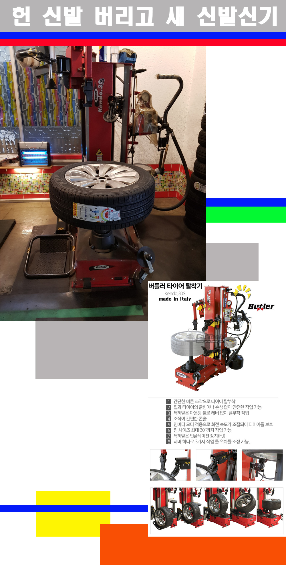 이태리 버틀러사의 켄도3.0S는 휠과 타이어와 조립과 분리시 전혀 제품에 손상을 주지않는 탈착기로 특히 센터락방식(중앙에서 휠를 고정하는 방식)이여서 휠의 중앙부위 잡아서 타이어를 탈부착하고 이후 상하롤러로 타이어를 탈부착합니다 특히 유니포미티작업(휠의 가장가벼운부분과 타이어의 가장 무거운부분을 매칭시키는 작업)시 작업자가 타이어를 정확한 지점에 휠과 매칭시킬수 있는 장점도 있습니다 유니포미티작업 불량시 과도한 진동값으로 핸들링불안 승차감저하 과도한 노면의 충격흡수를 가져와 주행감성을 해치는 첫번째 이유입니다 하지만 이런 작업을 무시하고 그냥 정적인 휠발란스작업만 하는것이 현실입니다 보통 타이어가격만 생각하시고 장착을 하시는데 꼭 이런 부분까지 챙길수 있는 샵을 권장합니다