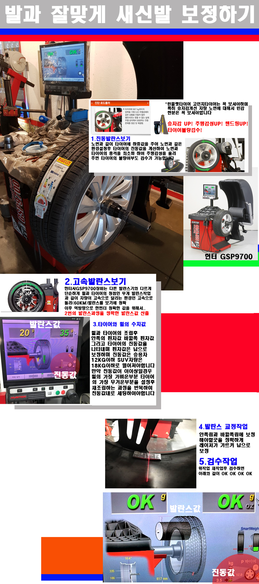이후 미국 헌터사 GSP9700장비로 고속 및 진동발란스로 더욱더 작업의 정확도와 정밀도를 높였습니다 이장비는 노면에서 올라오는 진동값까지 계산하여 발란스값을 보는 방식으로 진동발란스기는 헌터사GSP9700장비가 유일합니다 이후 역방향으로 60키로의 고속으로 다시 발란스값을 보정하는 방식입니다 그래서 노면에서 올라오는 진동를 잡을수 있으며 특히 타이어의 노면력 측정으로 타이어의 불량여부까지도 검수가 가능한 장비입니다 특히 고속발란스 측정시 타사 발란스기와 틀리게 고속으로 발란스를 보기에 차량이 고속으로 달리는 시뮤레이션 구현이 가능하여 정확한 발란스값을 볼수가 있습니다 그리고 작업자에게는 불필요한 발란스납을 붙이지 않아 미관상으로 좋고 납을 절약하는 고객님에게도윈이고 작업자에게도 윈윈할수 있는 장비입니다 그리고 시중에서 고속진동발란스라고 말하시는 샵들이 많은데 꼭아셔야하는것은 고속발란스는 말그대로 발란스를 볼때 고속으로 돌리기에 60키로 전후 그리고 진동값을 계산하기위해서는 발란스기에 진동롤러가 있어야합니다 그래서 미국헌터사 GSP9700장비가 유일합니다 다른 샵에서 말하는 발란스기는 고속진동발란스기능없는 일반발란스 기기입니다 이점 꼭 아시고 장착하시기를 바랍니다