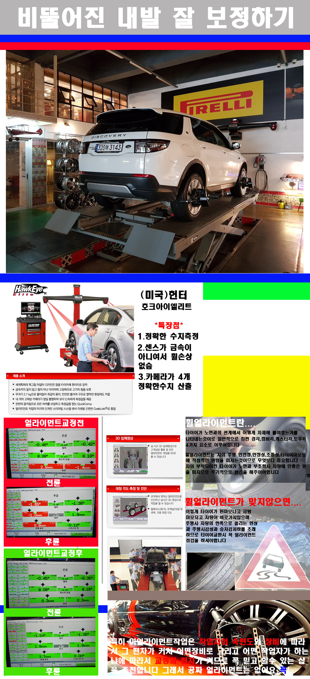 이후 미국 헌터사 호크아이엘리트 장비로 3D얼라이먼트를 진행했습니다 이장비는 현존하는 가장 진화된 얼라이먼트장비입니다 특히 4개의 고성능카메라가 장착되어져 있어 실시간으로 오차가 없는 측정값을 구현하며 바퀴당 각 휠센서 클램프가 프라스틱이며 타이어바닦면을 지지하는 방식이여서 휠의 손상이 없는것이 특징입니다 하지만 장비보다 차량의 얼라이먼트를 볼시 작업자의 정성과 그리고 능력과 숙련도가 관견이기에 꼭 휠얼라이먼트를 장사수단으로 하지않는 샵을 권장합니다 자사는 얼라이먼트정렬시 교정전 교정후를 구분하여 고객님께 직접 이수치값을 확인시켜드리고 작업을 하며 이후 각각의 특성을 가진 타이어들에 대해서 설명 및 관리요령 운전요령 같이 설명해드리고 있습니다 이후 타이어와 휠의 정확한 발란스값과 진동값을 보정후 헌터사 호크아이엘리트 3D얼라이먼트장비로 공장에서 처음 출고될시의 팩토리값으로 교정하였습니다 그리고 타이어질소가스주입기로 3번정도 진공상태로 만든후 질소가스를 주입했습니다 질소가스주입시 가장 관견은 순도이기에 이런 여러번의 진공상태후 주입하고 빼주는 과정를 많이 해주어야합니다 질소가스의 주입시 타이어공기압의 저하가 덜하고 화합물질이 반응을 하지않아 소음전파력과 그리고 타이어안쪽에 수분을 발생하지않으며 타이어안쪽에서의 공기압이 팽창하지않아 타이어에 스트레스를 덜주게 됩니다 하지만 이부분도 공기속에 질소가 80%정도 존재하기에 미미한 차이이지만 질소순도를 높이고 주행시 좋은 점이 확연히 많기에 질소주입을 해드리고 있습니다 특히 고성능타이어나 하중값을 많이 주는 타이어일경우에는 위에서 언급한 부분에서 많이 차이를 보이고 있습니다 이후 타이어왁싱후 출고했습니다+ 감사합니다